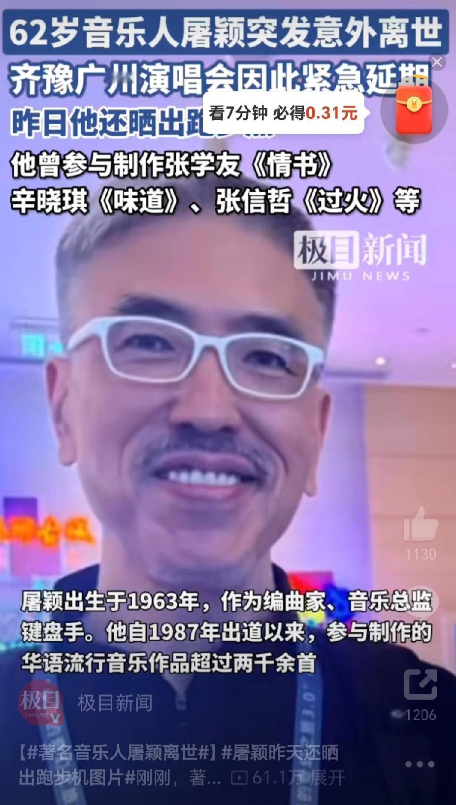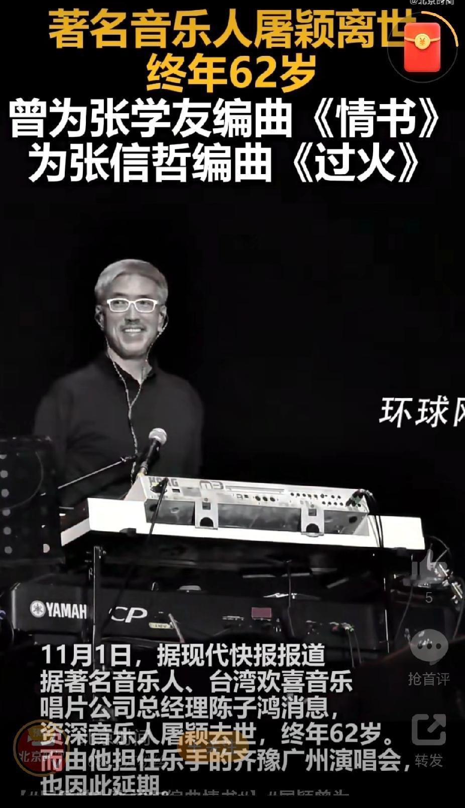 痛心!著名音乐人屠颖发生意外离世,享年62岁。一生创作2000多首作品。 就在刚刚,台湾唱片公司总经理陈子鸿在社交平台也公布了这一消息。他说45年的老友屠颖老师一路走好。这件事情发生的太意外了,要知道近期的消息,屠颖是在广州齐豫演唱会准备期间,因跑步发生意外离世的。 11月1日下午3点,齐豫“风采依旧”在广州演唱会还发布紧急公告表示,因团队成员突发意外,原定于11月1日的广州中山纪念堂举办的演唱会无法正常举行了。将会延期。 团队成员所说的发生意外,正是音乐人屠颖。要知道10月30日,屠颖还曾在微博公开自己将从台北飞往广州。昨天还跟粉丝互动,展示他在中山纪念堂外的风景,怎么一天就突然离世了呢?实在是太意外了。 屠颖还晒出自己在广州酒店使用跑步机的图片。1963年出生、今年62岁的作编曲家、音乐总监、键盘手等等的音乐制作人屠颖,从1987年出道以来,参与制作的华语流行音乐作品能达到2000多首。 几乎很多歌手都唱过他的歌,比如林志颖出道的《17岁的雨季》,张学友《忘记你我做不到》《情书》,辛晓琪的《味道》,张信哲的《过火》。许茹芸的《如果云知道》,都出自屠颖。 而近几年,屠颖一直在为周华健、齐豫等歌手筹划演唱会。担任重要的创作人团队人之一。所以有传言他是因为意外而离世的,可能人年龄大了,摔一跤就走之类的事情并不少见。所以人到了晚年,真的要多多注意呀。