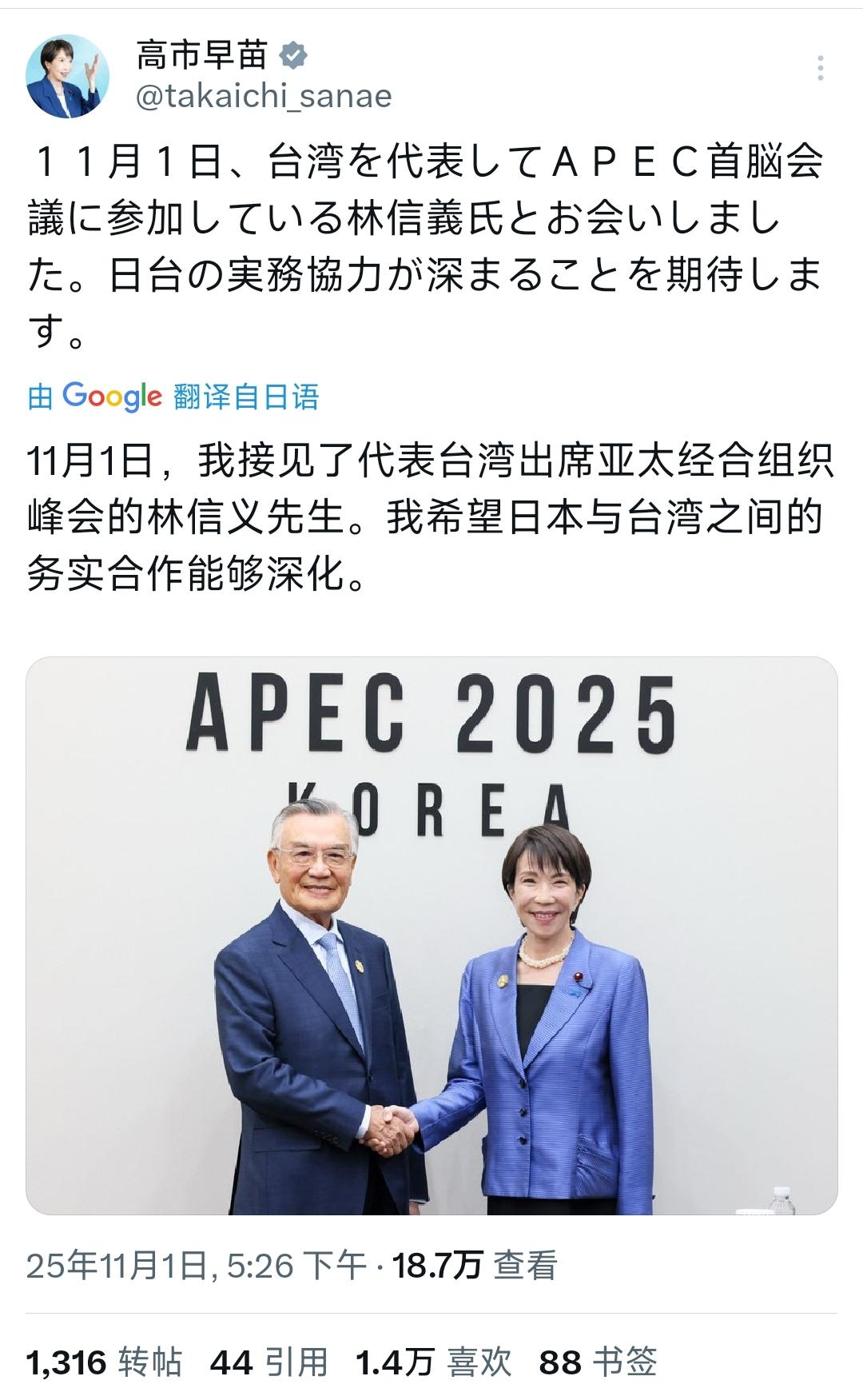 11月1号,在有限的时间当中,日本首相高市早苗还在APEC峰会期间,会见了台湾方面的参会代表林信义。这也是高市上任以来与台湾方面的第1次正式接触,那么如何看待这次见面呢? 首先,高市的确在台湾问题上变得非常谨慎。在她上任之后,赖清德、蔡英文等人在个人的社交媒体上对她发出了祝贺。但直到现在为止,高市对这些祝贺都没有作出回复。显然她是从中日关系的大局出发,有意地在对台关系上保持冷淡。 其次,从高市的角度来看,APEC的台湾代表林信义,应该是中国大陆方面可以接受的见面人选。否则如果中方反对的话,他也不可能出现在APEC峰会的现场。林信义是企业家和经济专业出身,早年是国民党,后来变成了无党籍,曾担任过岛内的所谓“经济部长”和“行政院”的副院长。在20多年前的陈水扁时期就作为代表出席过APEC峰会,赖上台之后又重新启用了他。 然后有意思的是,在高市早苗与林信义见面之后,台湾方面可谓是异常兴奋,似乎终于获得了高市早苗的关注和青睐。从赖清德到林佳龙,岛内很多绿营的政治人物都转发了高市早苗的这则推文,难掩自己的激动之情。这其实也能看出,这些独派力量对于日本尤其是高市早苗本人的期待。 当然高市与台湾方面代表的见面,也是为了回应国内保守右翼力量的一些诉求。但也能看出,高市在台湾问题上的确有她自己独特的想法与抱负。未来不排除她会与赖、蔡有更多的互动,甚至借助美日同盟与台湾进行更多的军事合作。这些都是未来中日关系当中的一些不确定因素和引爆点。