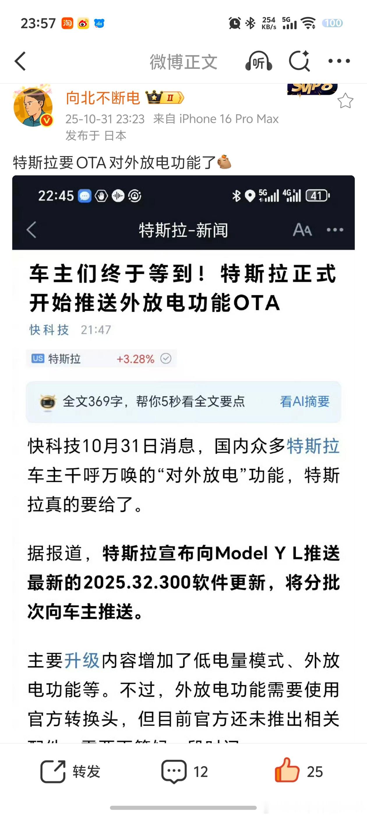 特斯拉对外放电功能可以用了,居然要通过OTA升级才行,这是我没想到的。现在其他品牌的电车,外放电功能插上就能用,不知道之前为何现在特斯拉才开放。