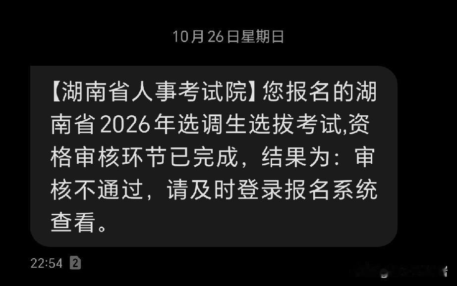 湖南选调生考试结果出来,两次“审核不通过”几个字,心情一下就沉了。所幸今天是最后一天,第三次成功了。 选调生终审不通过的显示方式多样,在官方系统里可能会直白显示“审核未通过”等字样,也有些地方会通过短信、邮件或者电话通知。 像我前两次就是在短信里看到结果,心里挺不是滋味。为这考试准备了不少时间,结果不尽人意。 提醒大家,报考后要时刻关注官方发布的信息,这样能及时知晓审核结果,早做打算。!