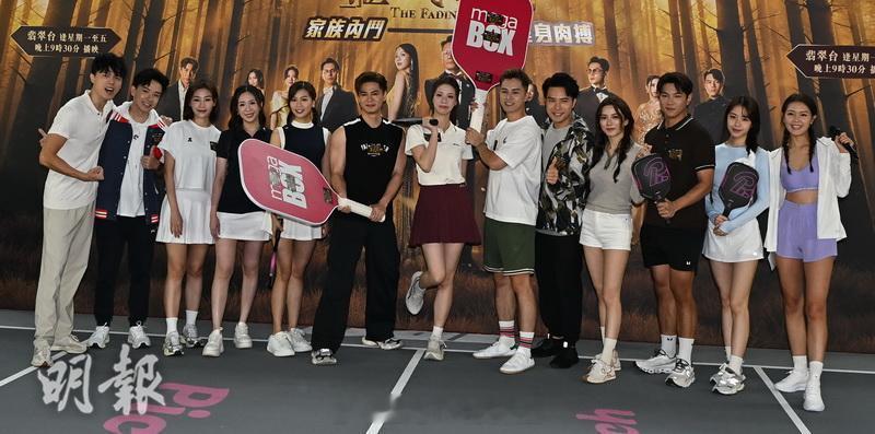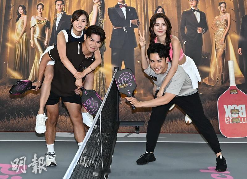 陈晓华、罗子溢、郭柏妍、陈星妤、何广沛等,今天(1日)出席TVB剧《金式森林》宣传活动,分队进行匹克球赛。陈星妤与郭柏妍身穿性感运动装,成为全场焦点。她们在双打赛中由陈浚霆及罗天宇背起,动作略显吃力。罗子溢与罗天宇被要求公主抱陈晓华及郭柏妍并进行深蹲动作,罗子溢表情显得吃力。