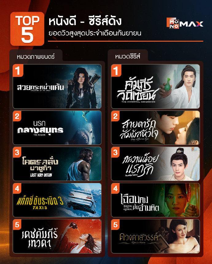杨洋《凡人修仙传》10月蝉联泰国MONOMAX视频平台剧集热度第一
