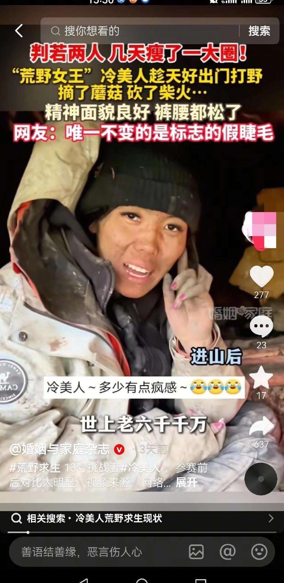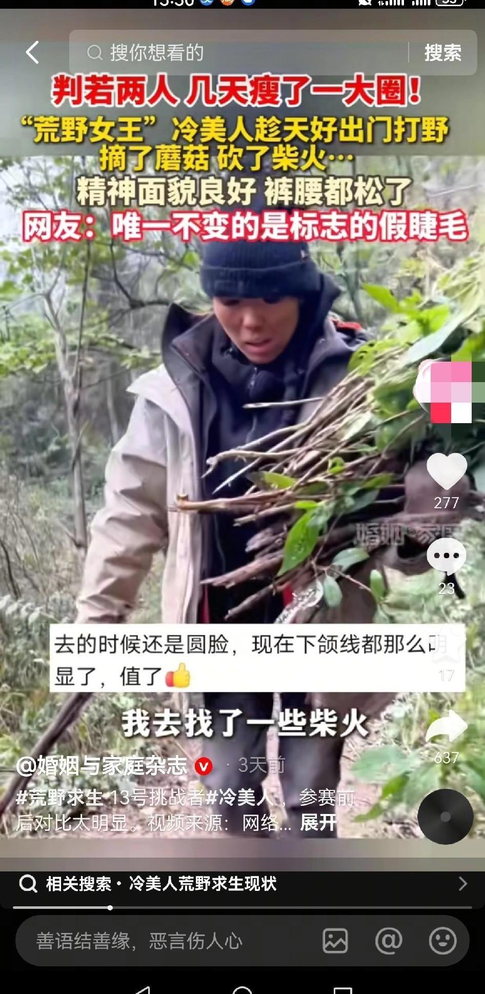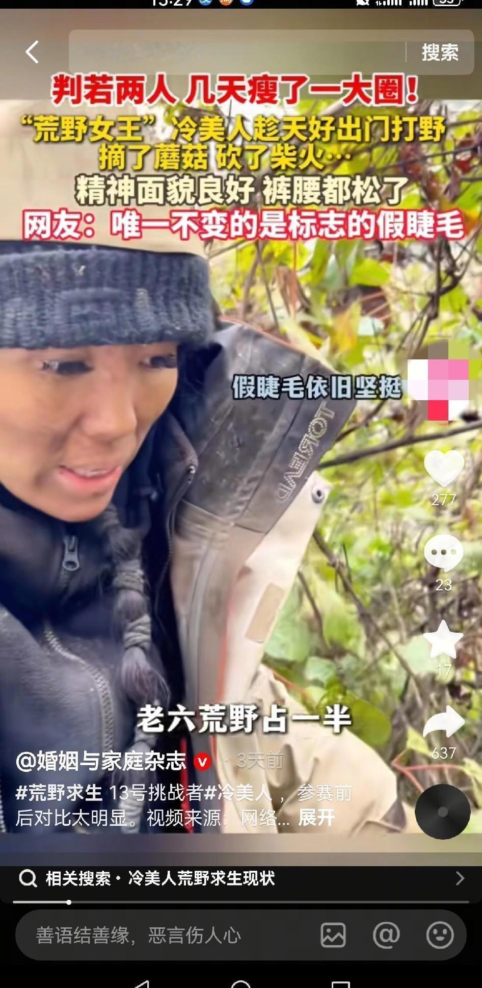 张家界的荒野里,出了个狠人。 她叫杨朝芹,一个顶着粉色美甲和假睫毛,在泥地里求生18天的女人。 这事儿可不是什么行为艺术,这是对“女人就该柔弱”这句话最直接的打脸。 比赛前,杨朝芹是名土木造价师,精致到睫毛都要分层种。进了山,她直接变成另一个人。饿到两颊凹陷,双手开裂,但那粉色的美甲和顽强的假睫毛,就像是她最后的倔强,在荒野里格外刺眼。有人开玩笑说她是“荒野美妆博主”,这哪里是美妆,这分明是战士的勋章。 从前闻到蘑菇味都皱眉头的都市丽人,现在面不改色地啃蚂蚱补充蛋白质。最让人佩服的是,暴雨里生火失败8次,她最后硬是靠咬自己胳膊的剧痛保持清醒,把火给生了起来。这种意志力,跟性别没有半点关系,这是刻在骨子里的强悍。 杨朝芹没有因为环境恶劣就放弃自己的身份特征,她恰恰是用这种方式告诉所有人,真正的强大,是无论在什么境地,都能保有自我。她不是在模仿男人,她就是在做最顽强的自己。 比赛奖金20万,给你一把刀,多数男选手都退赛了。 你觉得你能撑几天?