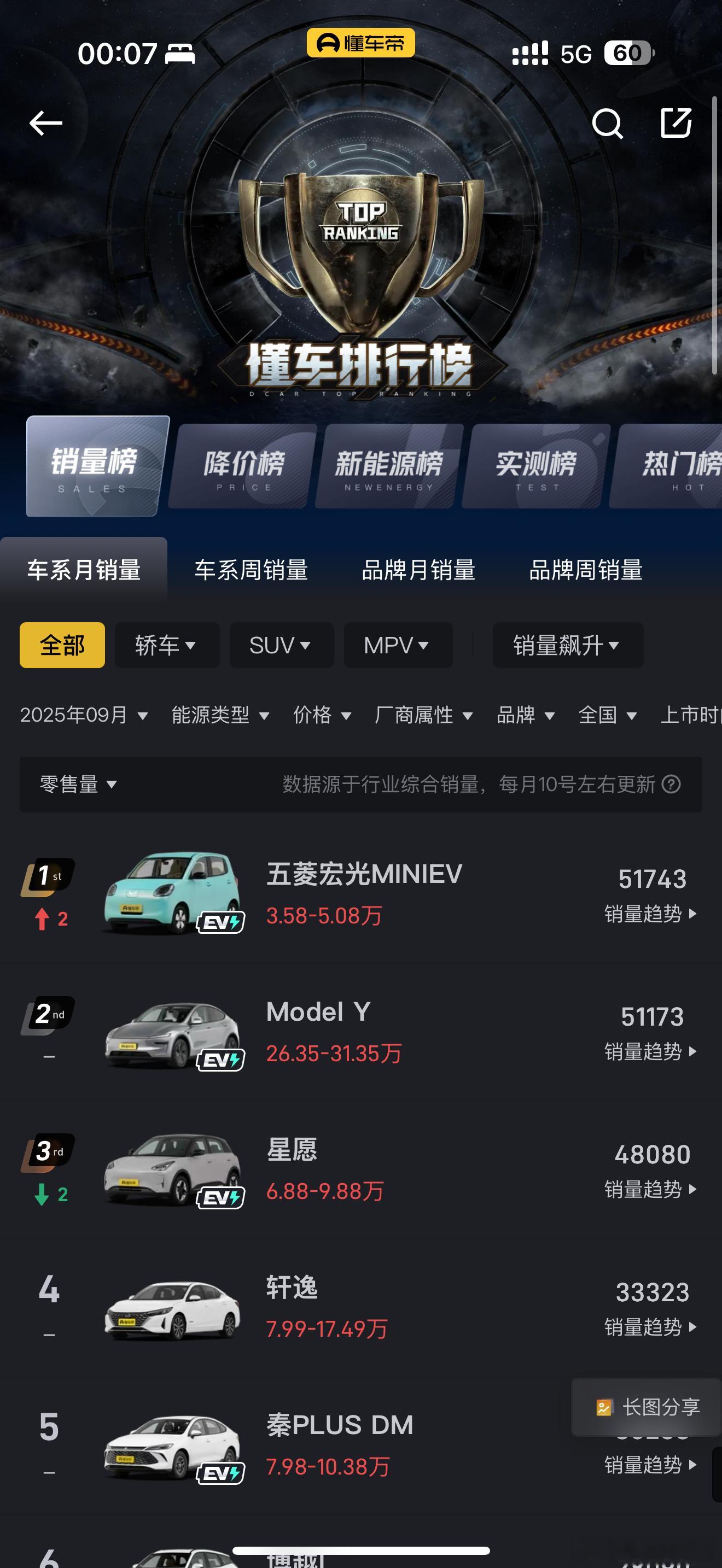 不过我看了看销量排行榜,按照这个比法,在纯电车五菱宏miniEV面前,在座的都是弟弟啊,人家单一车型五万多,你一个品牌这么多车都没五万辆!