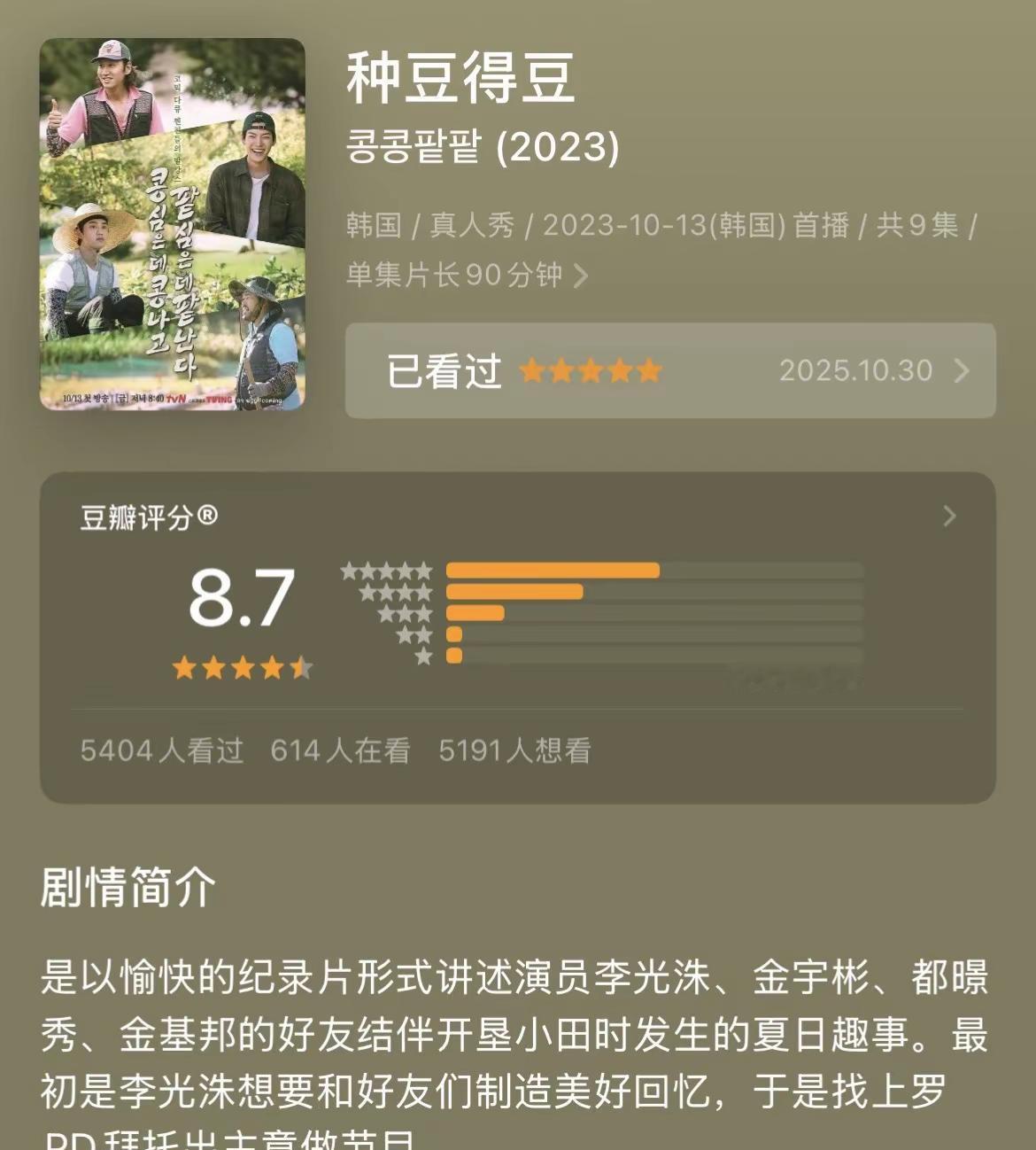李光洙种豆,都暻秀锄地,没人喊苦,但没人真闲着。 不是吃苦综艺,是四个大男人在地里找回了人味儿。 不演励志,不博同情,锄头一挥,笑出眼泪,比任何台词都真实。 他们不靠剧本,靠天气吃饭,靠彼此撑场。 种的是豆子,长的是人情。 城里人以为农活是诗,干了才知道,是腰酸背痛还怕下雨。 可他们偏不喊累,只说:“明天再来。 ” 罗英锡不拍苦难,拍的是—— 人和土地之间,最朴素的尊重。 不煽情,但看完心里像刚晒过的被子,暖乎乎的。