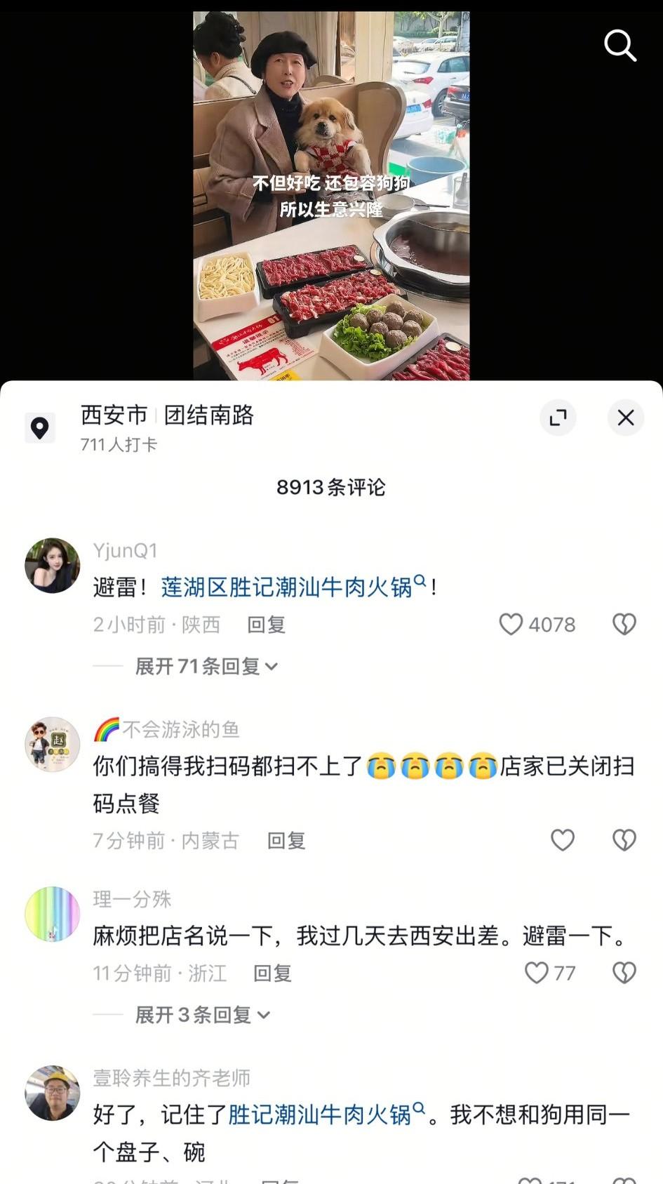 网上的一段视频,这位大妈带着狗狗在这家牛肉火锅店用餐,大妈对着镜头表示:这家店的东西不但好吃,还特别包容狗狗,所以这家店的生意肯定好…… 有网友扒出,这家店是西安的一家牛肉火锅店,看名字好像还是连锁的。 目前,大妈的这个视频有没有经过店方的同意,店方是否允许宠物进店?我们都不得而知!如果店家是知情的,大家真的要避雷这家店了!