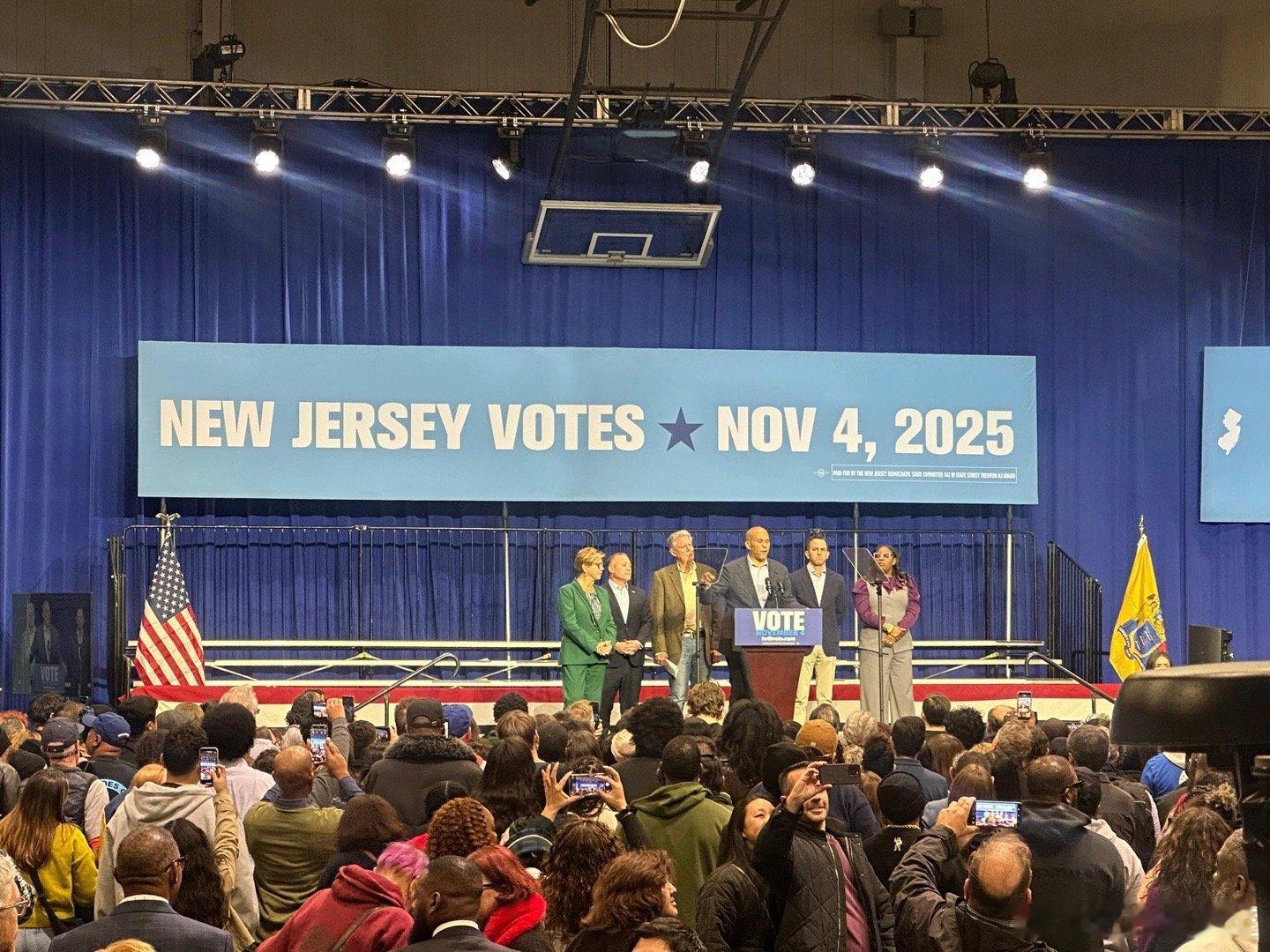 NJ是蓝州,但民主党候选人的民调结果不佳,今天的造势活动,除了受欢迎的前总统,本州联邦参议员、民主党全国委员会主席纷纷亲临现场