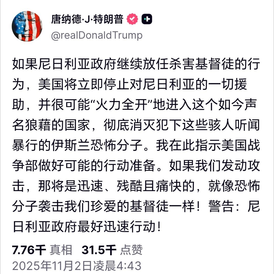 特朗普威胁警告尼日利亚特朗普发文:如果尼日利亚政府继续放任杀害基督徒的行为,美国将立即停止对尼日利亚的一切援助,并很可能“火力全开”地进入这个如今声名狼藉的国家,彻底消灭犯下这些骇人听闻暴行的伊斯兰恐怖分子。我在此指示美国战争部做好可能的行动准备。如果我们发动攻击,那将是迅速、残酷且痛快的,就像恐怖分子袭击我们珍爱的基督徒一样!警告:尼日利亚政府最好迅速行动!