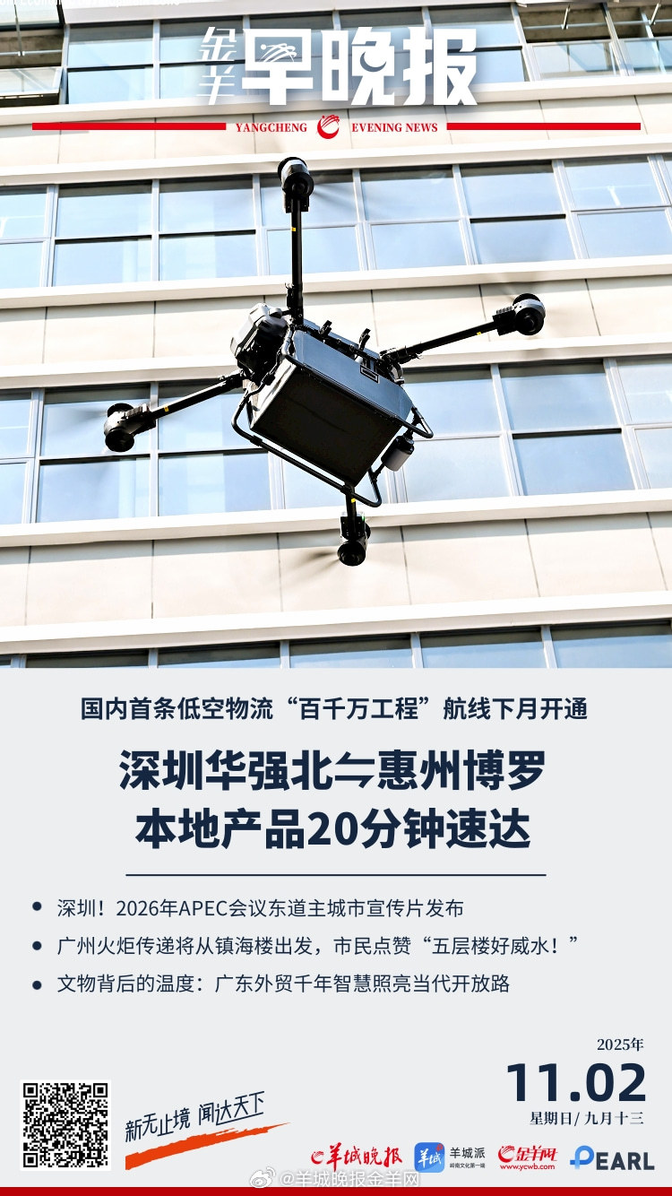 #金羊早晚报# 全国首条!“百千万工程”低空物流航线将于深圳华强北开通;粤西规模最大极地冰雪世界项目落子茂名;机器人创客与中外创客齐聚一堂!华强北打造“世界创客第一街”;深圳!2026年APEC会议东道主城市宣传片发布;文物背后的温度:广东外贸千年智慧照亮当代开放路;广州火炬传递将从镇海楼出发,市民点赞“五层楼好威水!”护航十五运会和残特奥会,1463名“小海豚”志愿者亮相广州地铁;太能吃!高中儿子半月花1000元妈妈绷不住了,你会给孩子多少饭钱?9.9元一个的玉米不为吃!这“文玩玉米”是咋回事?公司茶叶制品中非法添加番泻叶,被罚没602万余元!番泻叶是什么?著名演员冯淬帆去世,享年81岁,曾发文悼念许绍雄:“贤弟那边等,愚兄随后来”;黄仁勋:低估中国的实力那就太愚蠢了,曾笑称自己是“米粉”;被盗风险“长期遭低估”,法国卢浮宫将配防入侵装置;委内瑞拉总统谴责美国试图更迭委政权。#全国1%人口抽样调查##乌11名特种兵遭俄军击毙##美军机连续坠入南海最新调查曝光# 更多精彩报道,请扫码关注羊晚全媒体报道!