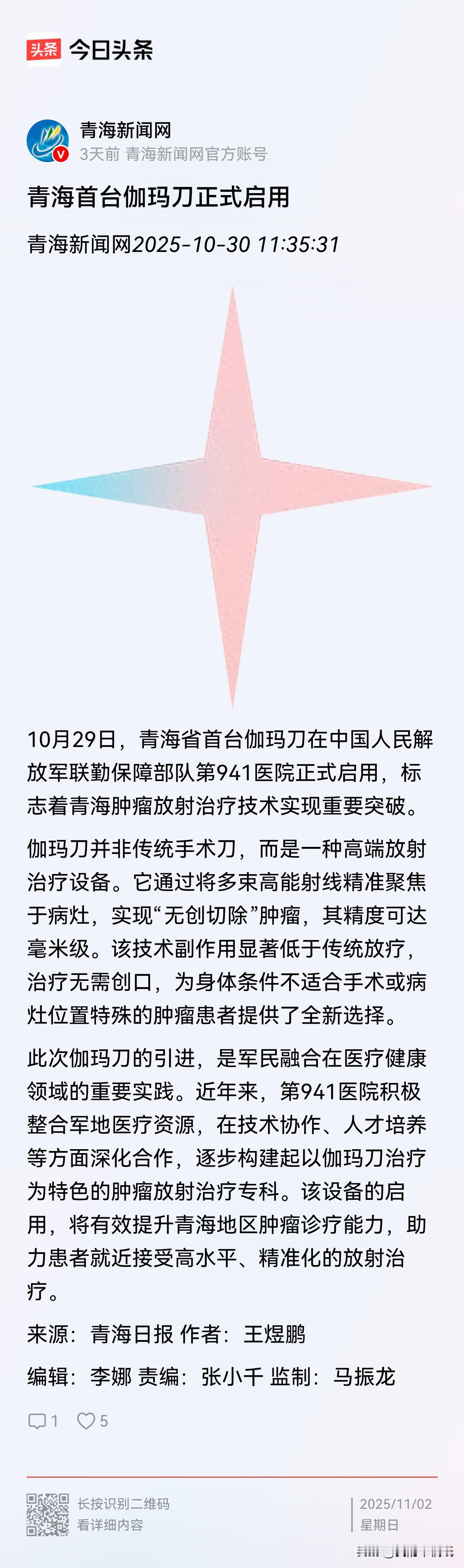 青海终于迎来了首台伽玛刀!这条令人喜忧参半的消息,揭开了青海医疗装备落后的伤疤。 听闻许多大病患者因传统化疗副作用痛苦不堪——掉发、牙松动,身体每况愈下。如今伽玛刀的出现,以其毫米级精度实现“无创切除”,为肿瘤患者带来全新希望。 然而,青海“仅此一台”的现实让人痛心!各大医院争创“N级甲等”时说得头头是道,却连一台伽玛刀都没有。青海人民为何要等到今天才能在家门口接受高端放疗? 这台伽玛刀是进步,更是警示。面对数百万青海民众的健康需求,一台设备杯水车薪。医疗装备的落后,直接关乎生命安危,这是最大的民生问题。 有关部门当以人民健康为重,积极配置资源,改变青海医疗装备的窘迫现状。生命不能等,青海人民的健康权益,不该成为被遗忘的角落!
