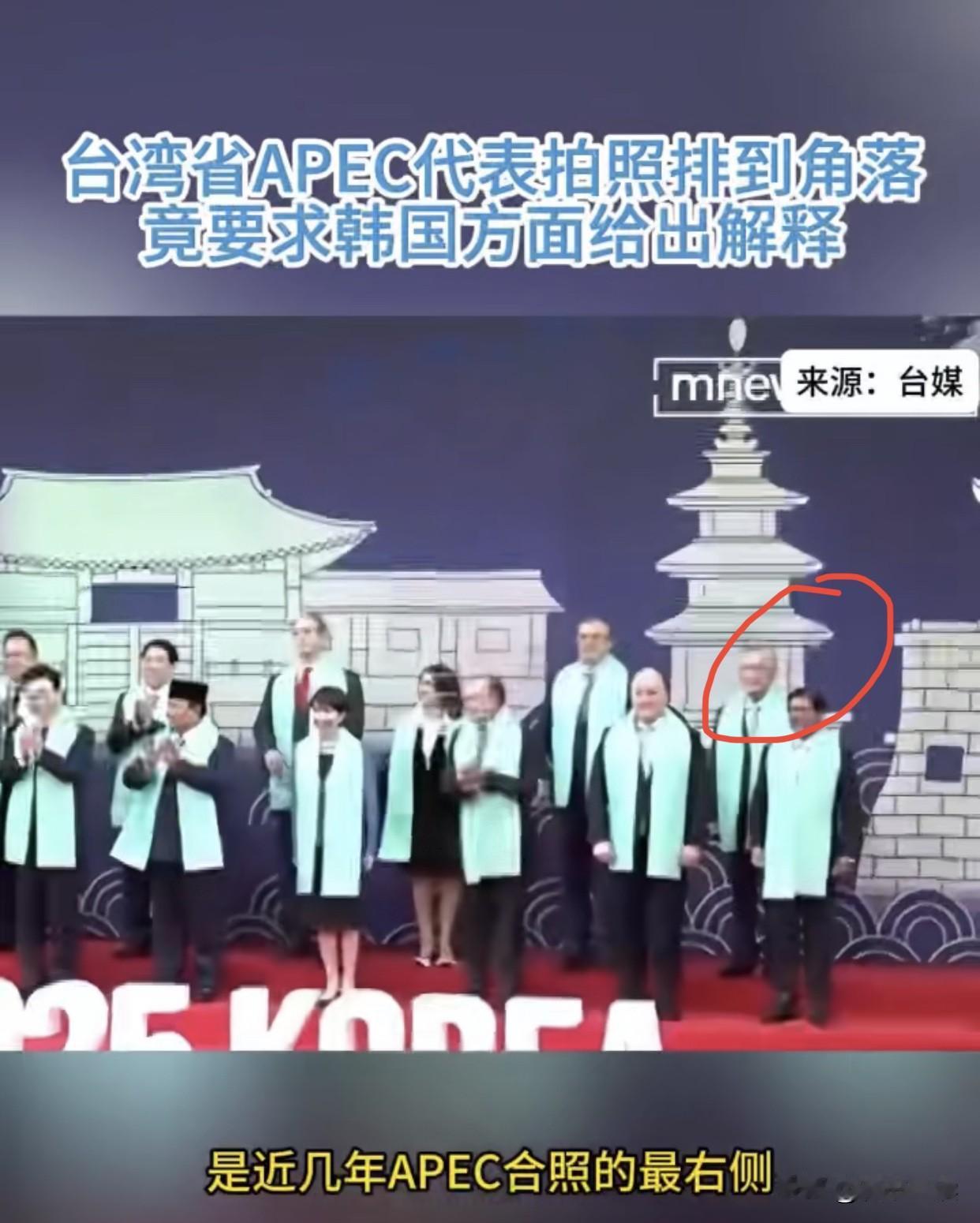 脸都不要了!台湾省APEC代表被按在角落,还敢逼韩方解释?先搞懂自己啥身份! 见过脸皮厚的,没见过这么脸皮厚的! 麻烦台湾省某些人先搞清楚:你们能踏进APEC会场,本身就是中国基于一个中国原则的善意让步,根本不是什么“国家资格”! 1991年签署的APEC谅解备忘录写得明明白白,中国以主权国家身份加入,台湾和香港仅作为“地区经济体”参与,台湾的正式名称是“中国台北”,连“外长”都没资格参会,只能派经济相关官员出席。 说白了,你们就是中国领土下的一个地区代表,不是什么“国家代表团”,能有个位置站着,已经是给足了面子! 当年陈水扁想蹭APEC峰会,被韩国直接怼回“绝对不可能”,理由很简单:台湾不是主权国家,没资格派最高领导人参会。 现在不过是拍照站了角落,就急着跳脚叫板,真把自己当成平等的“国家成员”了?忘了自己连主办APEC会议的资格都没有,忘了所有参会权利都是基于一个中国原则的特殊安排?