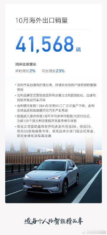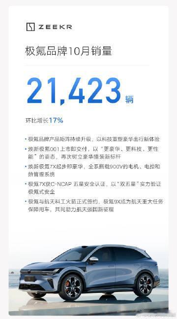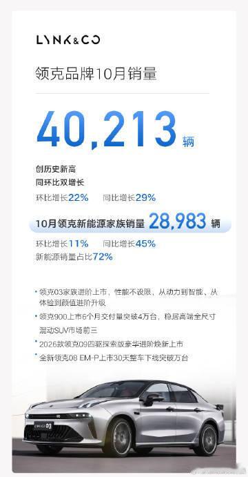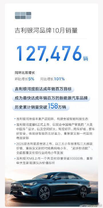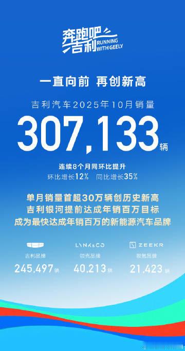吉利汽车10月销量超30万辆,刷新单月纪录!吉利银河提前达成年销百万目标,成为最快达成年销百万的新能源汽车品牌!
