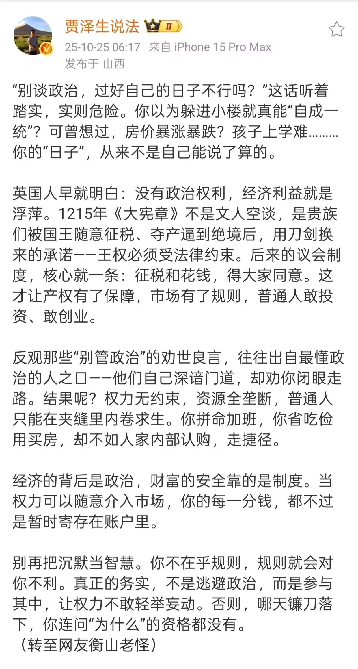 普通人该不该谈政治?政治这个话题可能太大,但是,关心社会还是应该的,让社会变得越来越好,这是每个人的责任。关心社会,认知很重要,观念很重要,要不断学习,跟着智者走,路越走越宽。