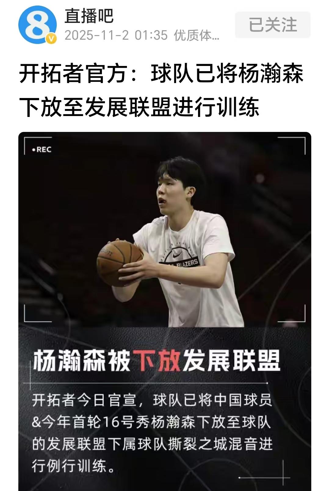 今日凌晨开拓者队发布重磅消息,杨瀚森遭遇重大挫折,杨妈连发三条动态。 就在部分球迷和媒体人大吹特吹杨瀚森的时候,时间还不到三个月,今日凌晨开拓者做出重大决定,下放杨瀚森到发展联盟。这意味着他在常规赛没球打了,如果继续在发展联盟呆两年,这就意味着杨瀚森彻底完了,命运比周琦还惨,杨吹说的超越易建联已成为大笑话。 杨瀚森打了五场常规赛,表现糟糕,根本达不到打Nba的水平。也许杨瀚森妈妈预感情况不妙,近日在社媒连发三条动,她写道:“今天虚胖的瀚森,状态下滑的他,谁的责任?只有妈妈知道!”真是儿行千里母担忧啊。其他两条动态是引用一些哲理名言鼓励儿子。如今杨瀚森被下放发联盟,前途未卜,这让杨妈更加牵挂和担忧了。