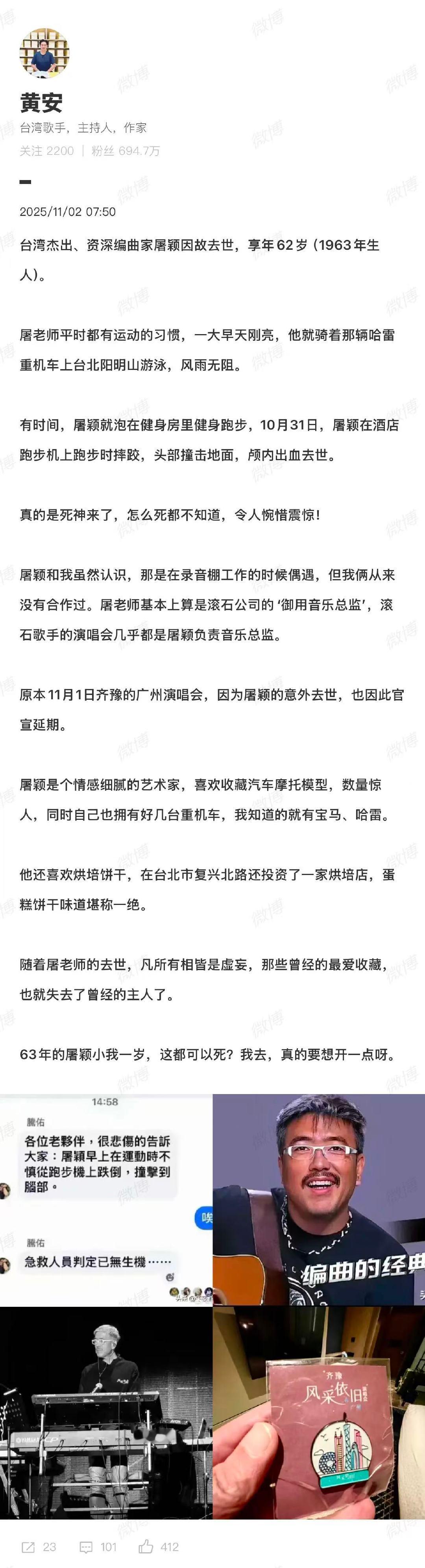 屠颖离世原因屠颖使用跑步机时摔跤致颅内出血 11月2日,发文透露屠颖离世原因:“屠老师平时都有运动的习惯,一大早天刚亮,他就骑着那辆哈雷重机车上台北阳明山游泳,风雨无阻。