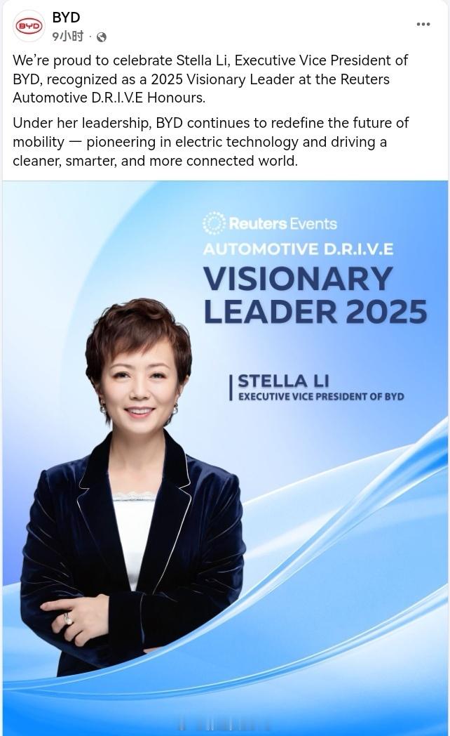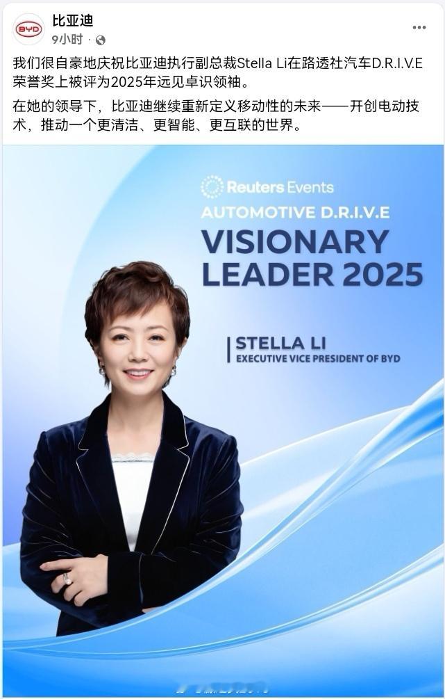 比亚迪执行副总裁李柯荣耀“2025远见卓识领导人”