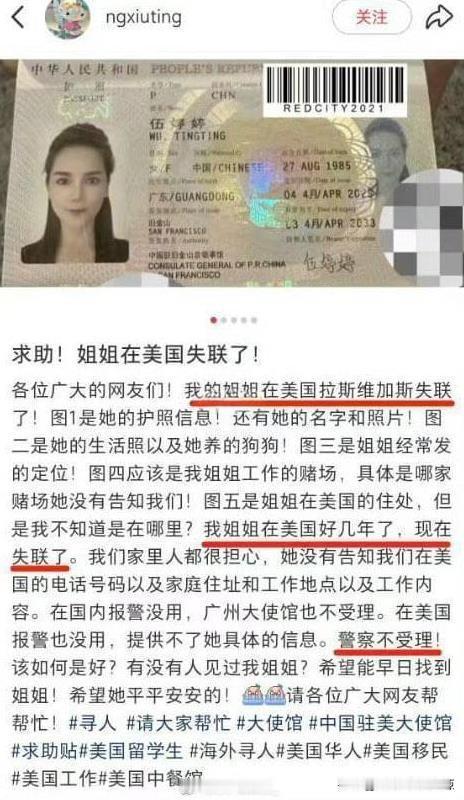 坏消息 姐姐在美国失联了。 好消息,通过网络媒体的力量 姐姐终于找到了。 但是-还不如不找到。 有网友在网络平台求助,称自己的姐姐在美国拉斯维加斯失联了 并且发了姐姐的生活照,希望网友帮他寻找。 结果没多久就有网友回复:说他姐姐是在美国当老鸨的,为什么失联呢?因为上周被警察抓了[捂脸]