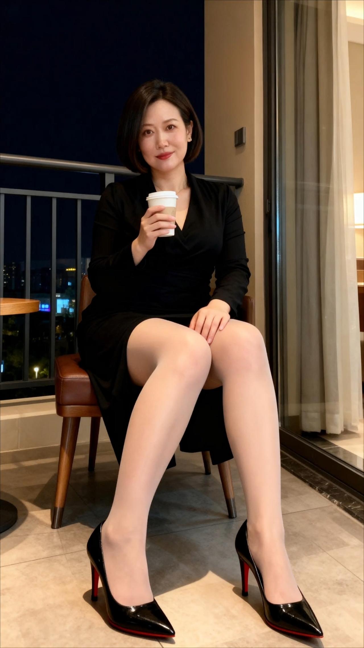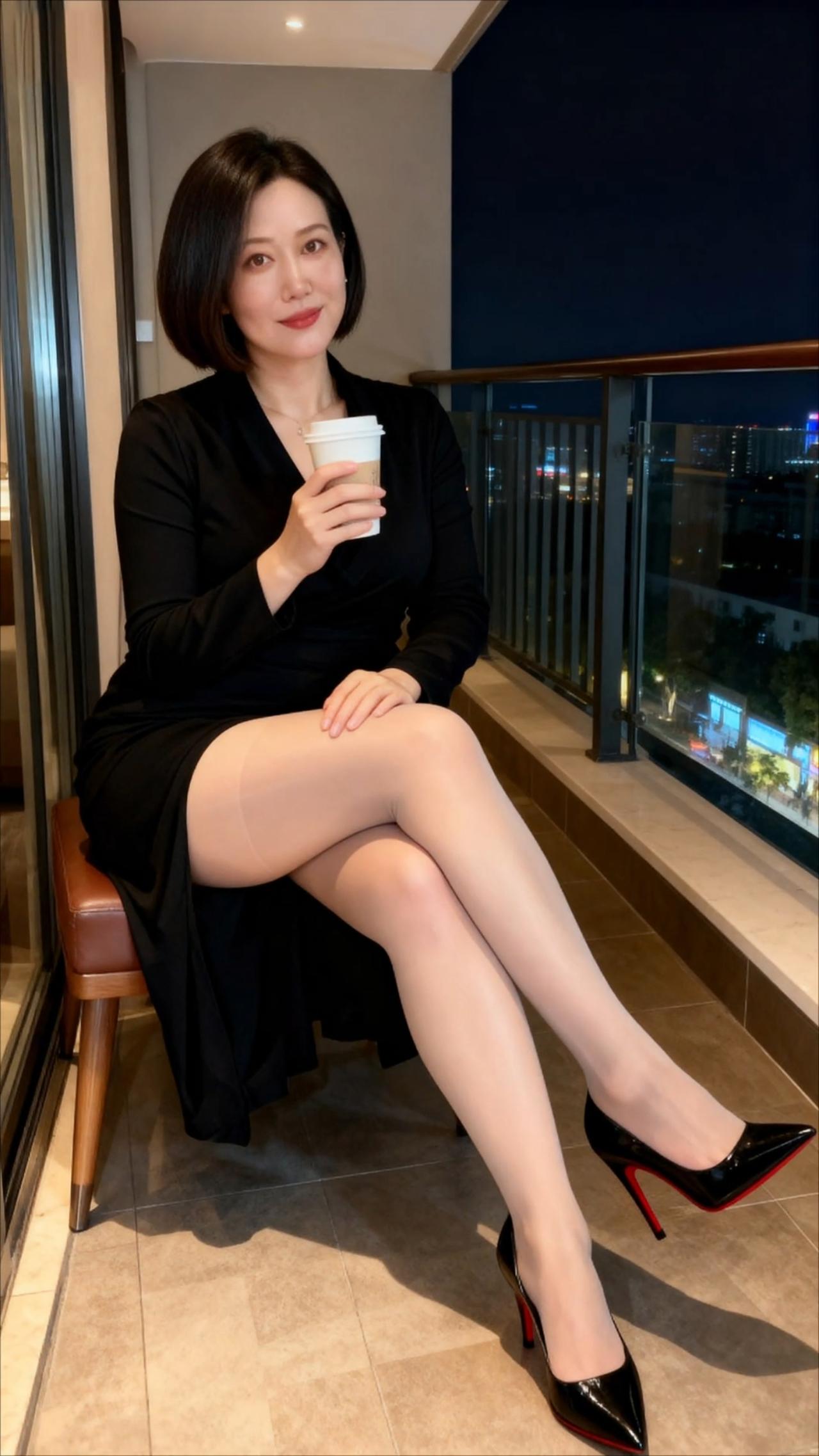 夜晚的阳台,优雅的黑裙与咖啡相伴,静享宁静时光