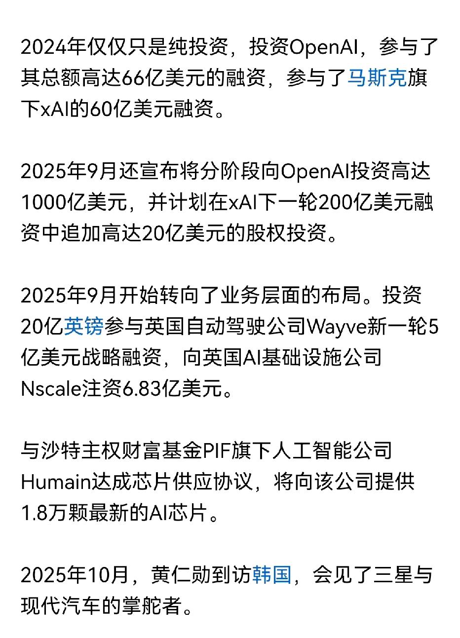 在中国穿唐装,在韩国吃炸鸡,密集的亚洲之行,黄仁勋妥妥的社牛。 他不仅留着华人的血液,还继承了华人的商人风格。 前段时间在中国滑铁卢,让黄仁勋开始改变自己的战略方向了:技术再厉害、使用场景在厉害,没有市场也白做。 所以黄仁勋正在进行产业链的下游布局。 他的布局涉及到自动驾驶、AI基础设施等下游应用领域。 看来,黄仁勋不甘于仅仅只掌握技术上游,还在积极谋取下游的话语权。 黄仁勋 黄仁勋要做的不只是AI还要接管方向盘你问我答 英伟达 黄仁勋再访北京皮衣换西装 黄仁勋定律 黄仁勋 如何评价英伟达的CEO黄仁勋 黄仁勋密集亚洲之行透露出哪些信号 你问我答