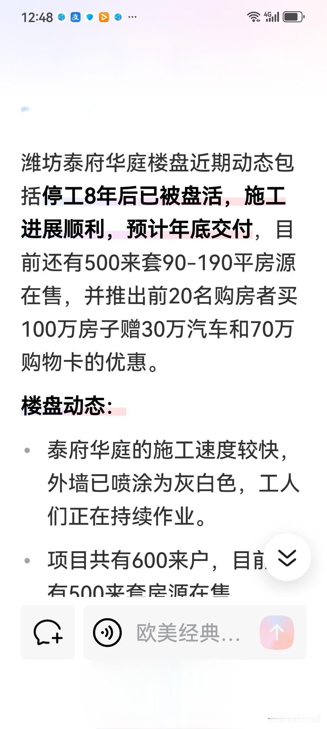 潍坊著名的烂尾楼善水国际经过潍坊市政府的重组涅槃重生,改名泰府华庭楼盘今年底交房。 泰府华庭,近日推出了潍坊市有史以来最大的优惠活动,优惠力度空前绝后 第一。买房送30万汽车一辆。 第二。买房送70万购房卡一张。 第三。名额有限,只限前20名购房者。 面积从99平方到199平方。 泰府华庭位置在北宫街和平路紧靠白浪河公园,位置极佳。有需要的购房者可以到现场参观。