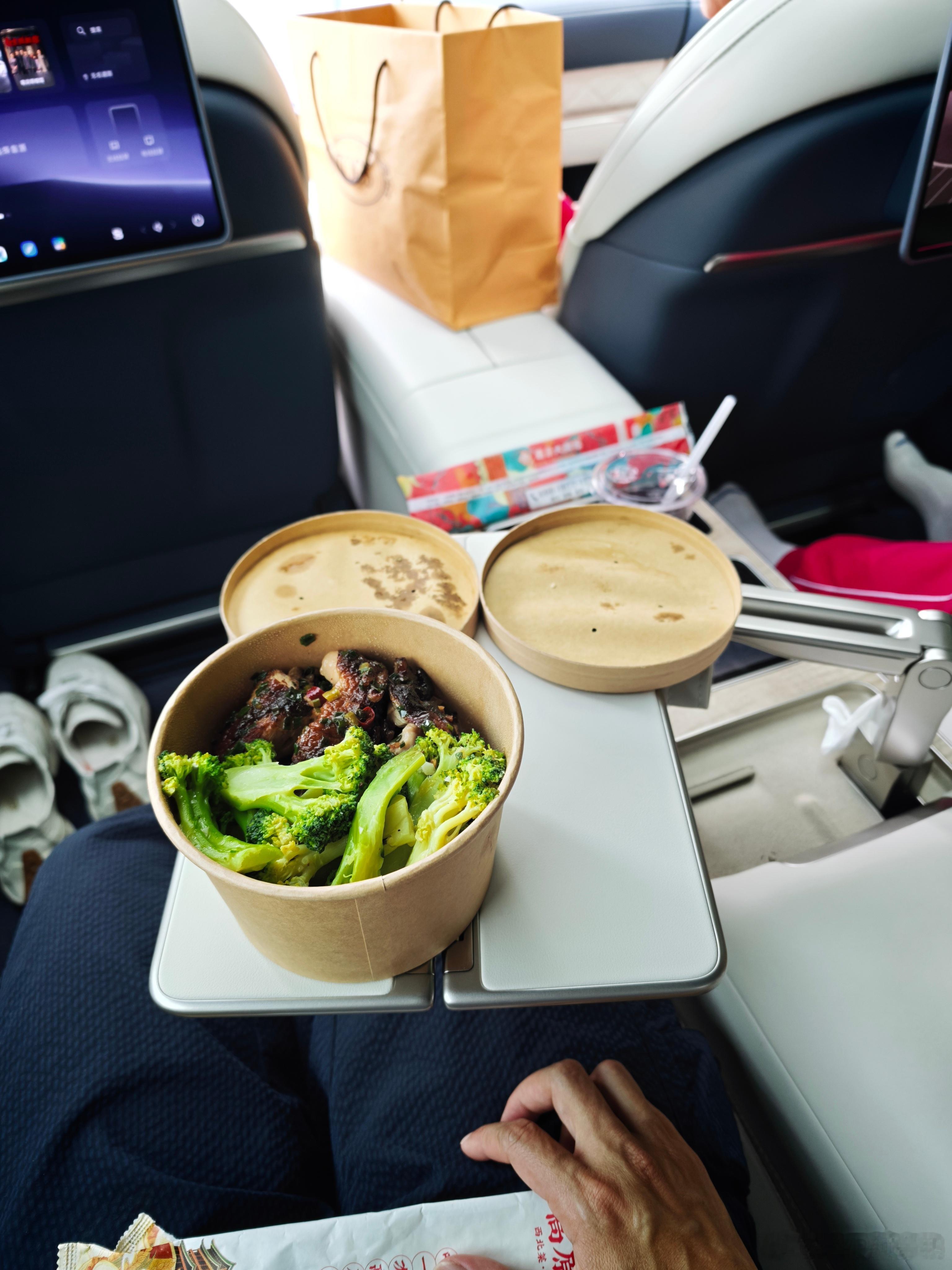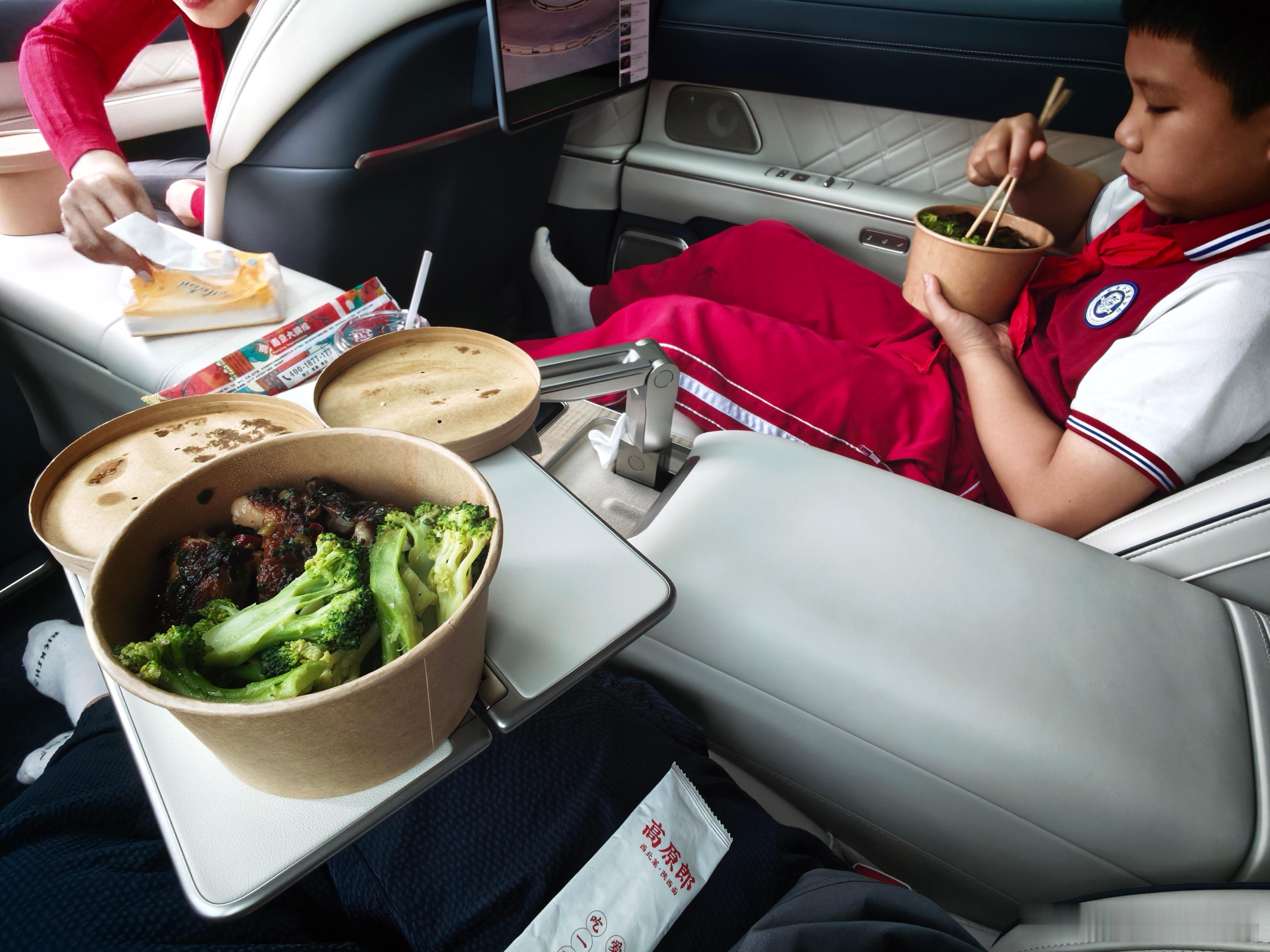 第一次三口人在大家车的蔚来et9上开餐,后排空间是大,但只有一个小桌板是真不够