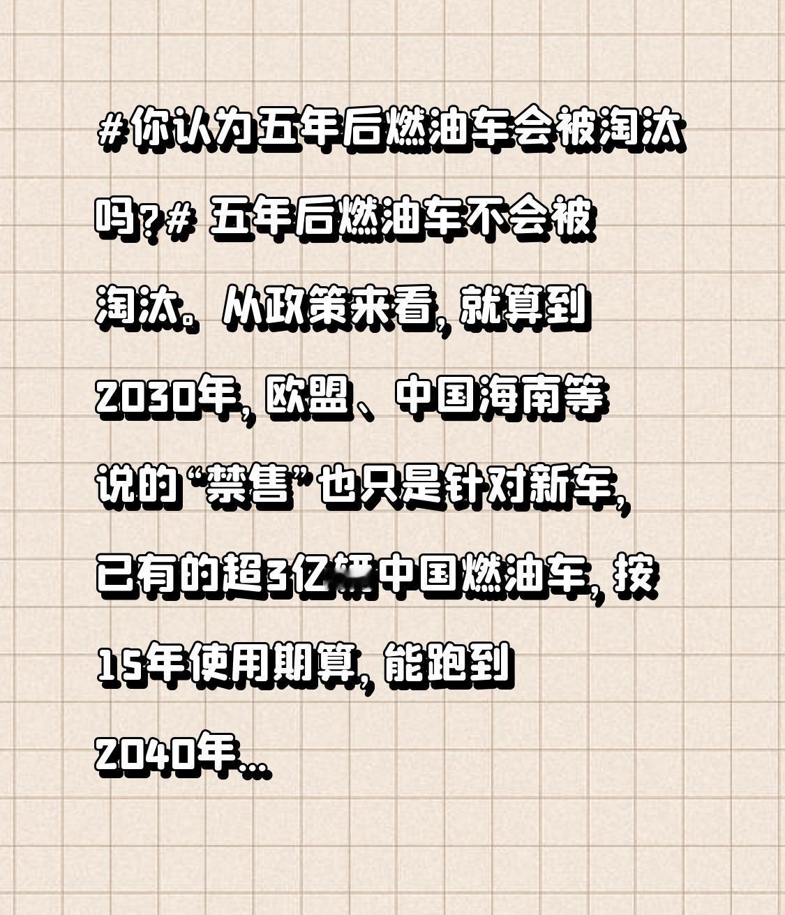 你认为五年后燃油车会被淘汰吗? 五年后燃油车不会被淘汰。从政策来看,就算到2030年,欧盟、中国海南等说的“禁售”也只是针对新车,已有的超3亿辆中国燃油车,按15年使用期算,能跑到2040年后,挪威2025年禁售,2030年路上仍有30%是燃油车。 技术上,新能源车在极寒、高原地区续航下降超50%,长途货运或越野时,燃油车故障概率仅为新能源车三分之一,像比亚迪DM - i混动油耗每百公里3.8升。 市场方面,农村等下沉市场充电桩不到城市三分之一,东南亚、非洲充电桩覆盖率不到10%,大家更倾向选燃油车。所以五年后燃油车会和新能源车多元共存。