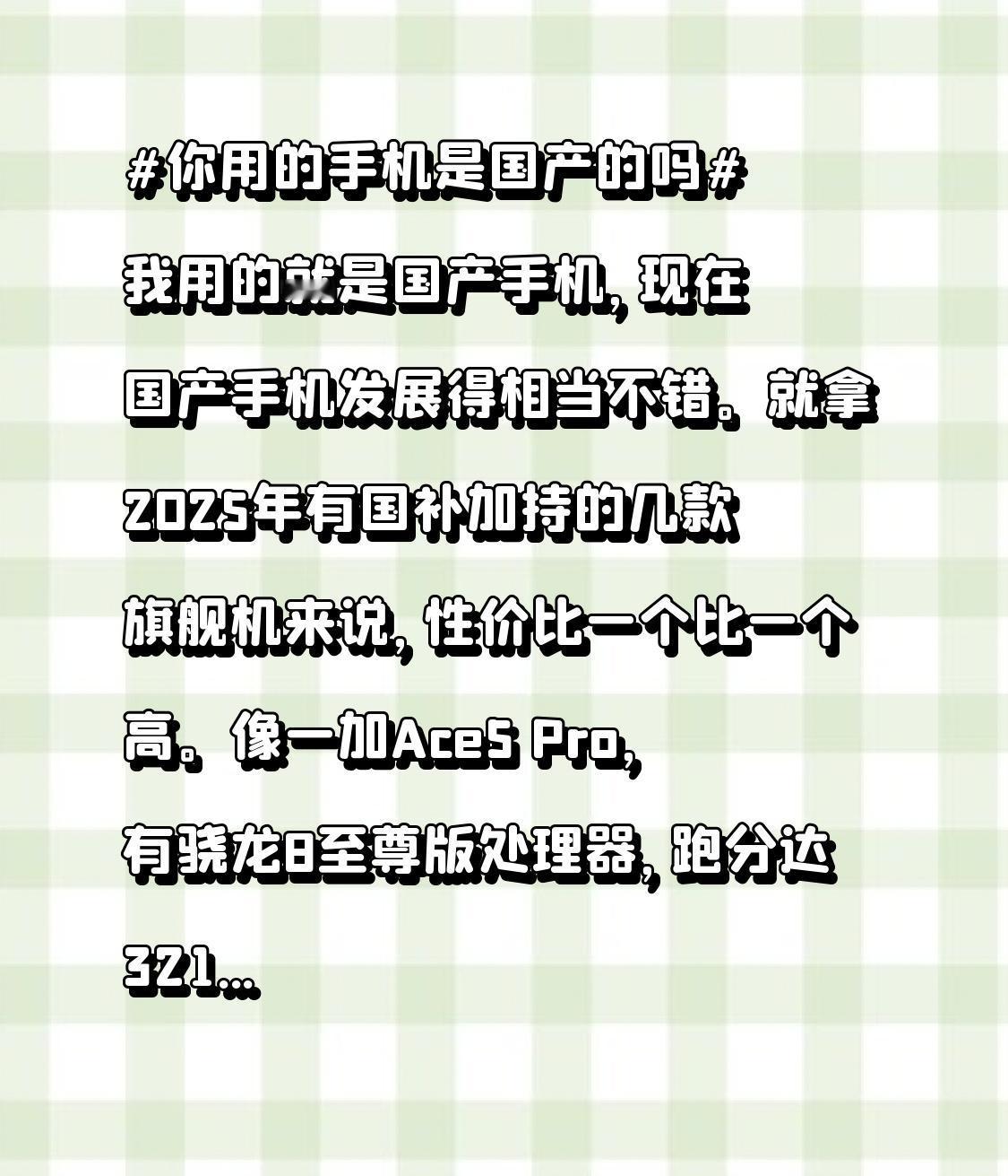 我用的就是国产手机,现在国产手机发展得相当不错。就拿2025年有国补加持的几款旗舰机来说,性价比一个比一个高。 像一加Ace5 Pro,有骁龙8至尊版处理器,跑分达321万,还有6100mAh电池和100W快充,国补后只要2549元。真我GT7 Pro竞速版也很猛,6500mAh大电池搭配120W快充,国补后2465元,重度用户用着超爽。OPPO Find X8影像能力出色,机身轻薄,国补后3299元。这些国产手机各有优势,完全能满足不同需求,选国产手机准没错!