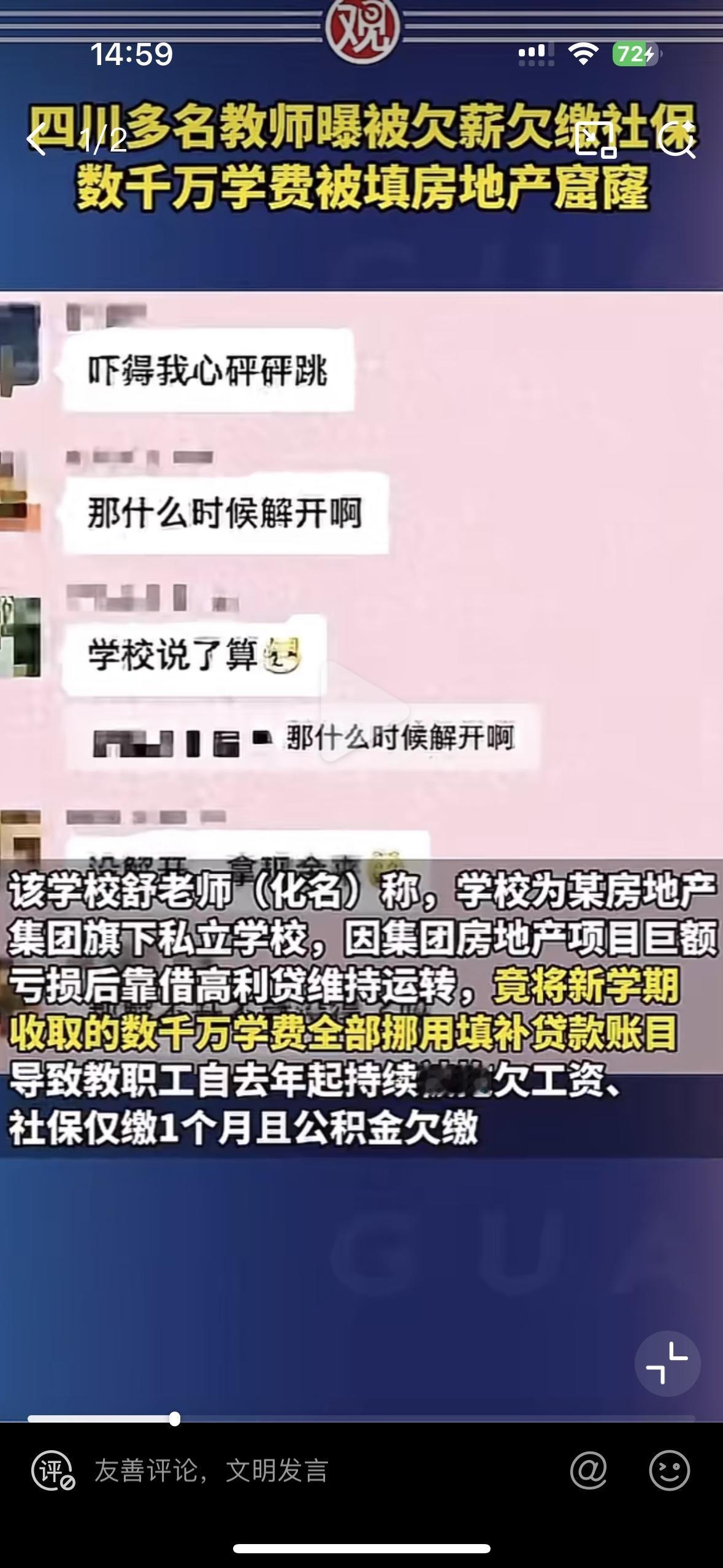 太离谱了!房地产集团开的私立学校被资本当成了提款机 四川一私立学校数千万的学费被自己的母公司拿去填补房地产亏空和高利贷 老师们拿不到工资,社保也断缴了一年多,老师们辛辛苦苦上班,工资都发不出来,学生交的学费也被拿去填窟窿,老师们离职的离职,怎么能这么缺德?