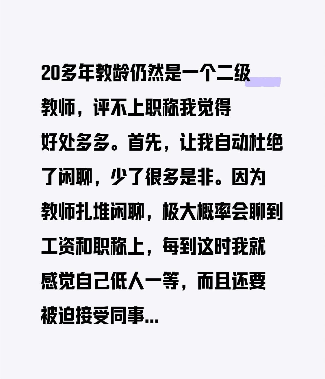 20多年教龄仍然是一个二级教师,评不上职称我觉得好处多多。 首先,让我自动杜绝了闲聊,少了很多是非。 因为教师扎堆闲聊,极大概率会聊到工资和职称上,每到这时我就感觉自己低人一等,而且还要被迫接受同事们的同情,让自己浑身不自在。 于是,我选择不扎堆,你别说,好多同事因为口头是非关系不融洽,我却没有这方面的烦恼。 还有,因为职称已经严重影响我的生活了,所以,我选择接下来一年一定要评上职称。 这让我像年轻人一样想当班主任,天天盯着有没有优质课评选活动,有没有骨干教师培训活动,反正这些我都积极参与,说不定就获奖了呢。 没有评上职称,收入比同龄教师低得多,为了追上他们的工资,我不得不开源节流,又是写小说又是在网上有偿批改作业的。 辛苦虽然辛苦,但让我庆幸的是,老了老了,竟然成了斜杠青年,懂得还挺多。 大家说说,我没有评上职称,是不是还因祸得福呢?