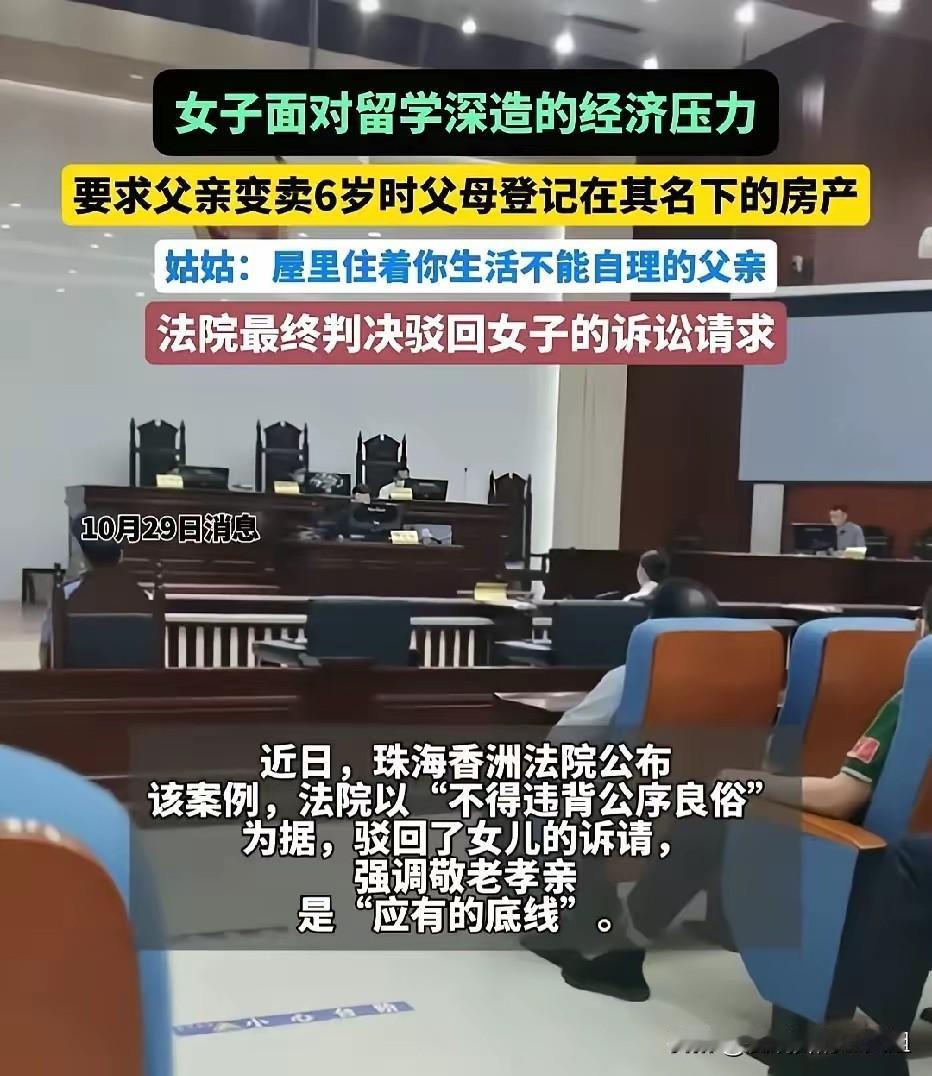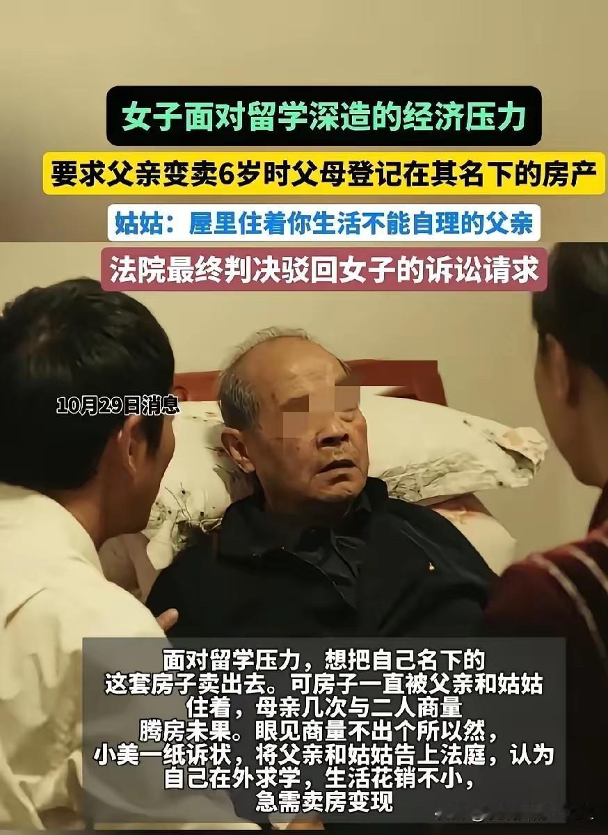 广东珠海,男子和妻子购买一套房子,登记在6岁的女儿名下,后续两人离婚,女儿抚养权归女方所有。多年后女儿长大成人,计划出国留学,为筹措学费决定卖掉房子。不料,该房屋早已被父亲及姑姑入住,女子担忧姑姑会借机侵占房产,女儿也多次要求病重的父亲搬离,却遭父亲以“搬离不利于养病”为由拒绝。协商无果后,女儿选择将父亲和姑姑告上法院,要求腾出房屋,法院这样判了。 法院的判决出乎不少人意料——女儿小美的诉讼请求被驳回了。法官说得明白,房子虽然登记在小美名下,那是她6岁时父母赠与的,属于“纯获利益”的行为。现在父亲身患重疾,作为女儿不能只顾自己留学需要资金,就要求病重的父亲腾退唯一住所。这个判决依据的是《民法典》第八条,民事活动不得违背“公序良俗”。 这场官司背后藏着更深层的家庭伦理难题。房产证上名字代表的所有权,撞上了血浓于水的赡养责任,法律选择了保护更基本的人伦底线。小美父亲情况确实特殊,脑梗后二级伤残,生活不能自理,连租房的能力都没有。姑姑住在这里不是为了占便宜,而是照顾病重的弟弟。法院认为允许父亲继续居住,既是对传统家庭伦理的尊重,也契合社会主义核心价值观。 不少人觉得房产证写谁的名字房子就是谁的,这种想法在家事纠纷中可能过于简单了。法律保护物权,但物权的行使不能违背基本的社会道德。小美需要留学资金是现实需求,但当她行使自己的所有权会直接威胁到父亲的生存权时,法律就必须权衡孰轻孰重。法官在判决中引用了“哀哀父母,生我劬劳”的古语,强调“敬老孝亲”是应有的底线。 这起案件也折射出当代家庭教育的一些缺失。孩子被培养得能够走向世界,却可能在追逐个人发展的过程中,与家庭的情感联结变得脆弱。一个人的成熟,不仅在于能否出国读书、在异乡立足,也在于是否懂得珍视家庭、理解责任。 判决后,小美的姑姑给法院送来了锦旗和感谢信,感谢法院“让弟弟得以继续在屋内安宁生活”。这个细节表明,判决虽然从法律上否定了女儿的诉求,但在人情层面试图为这个家庭保留一丝温情。 各位读者你们怎么看?欢迎在评论区讨论。