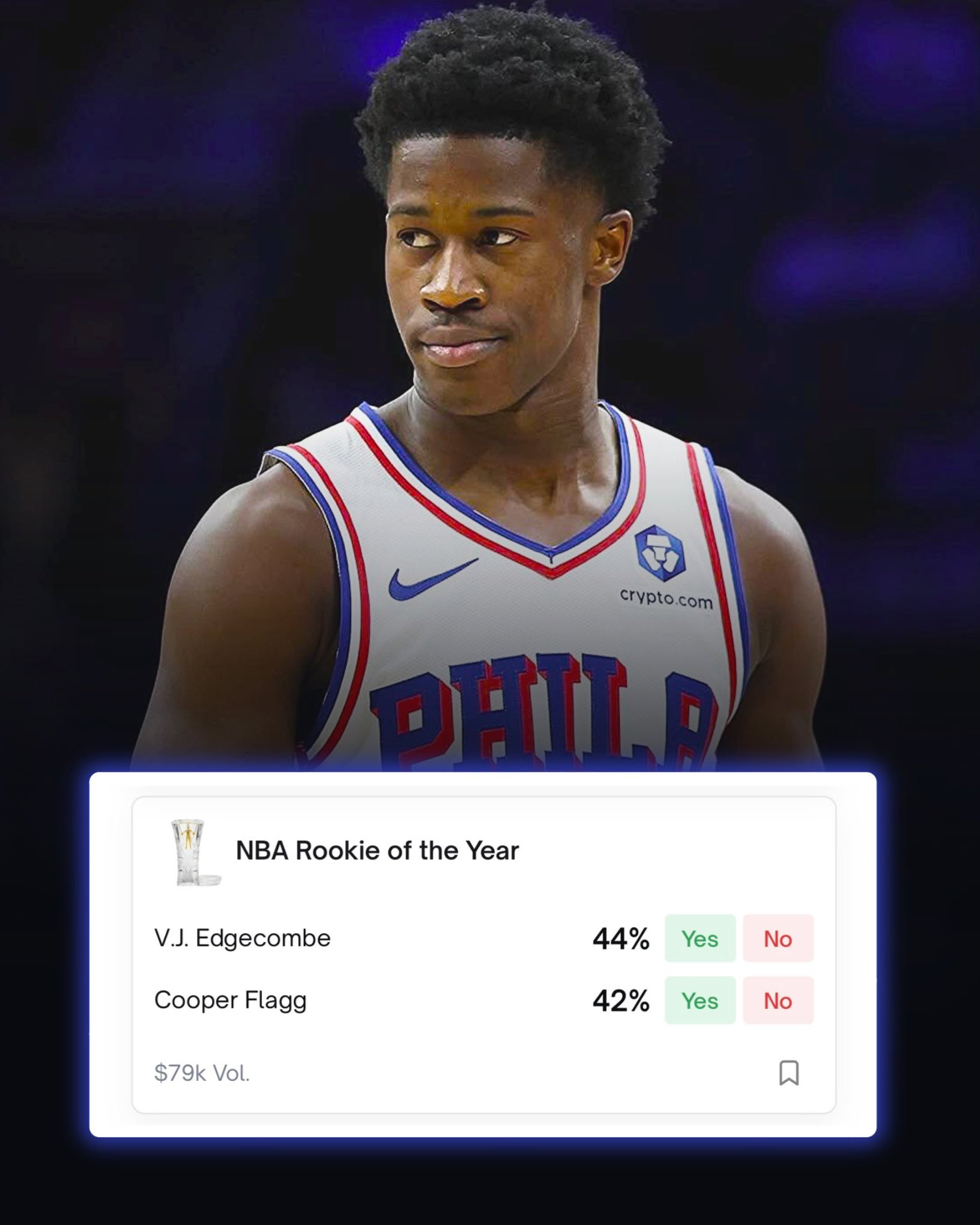 前途无量!据知名预测网站Polymarket Sport报道,截止目前,VJ·埃奇库姆已超越库珀·弗拉格成为最有希望赢得年度最佳新秀的球员![并不简单]