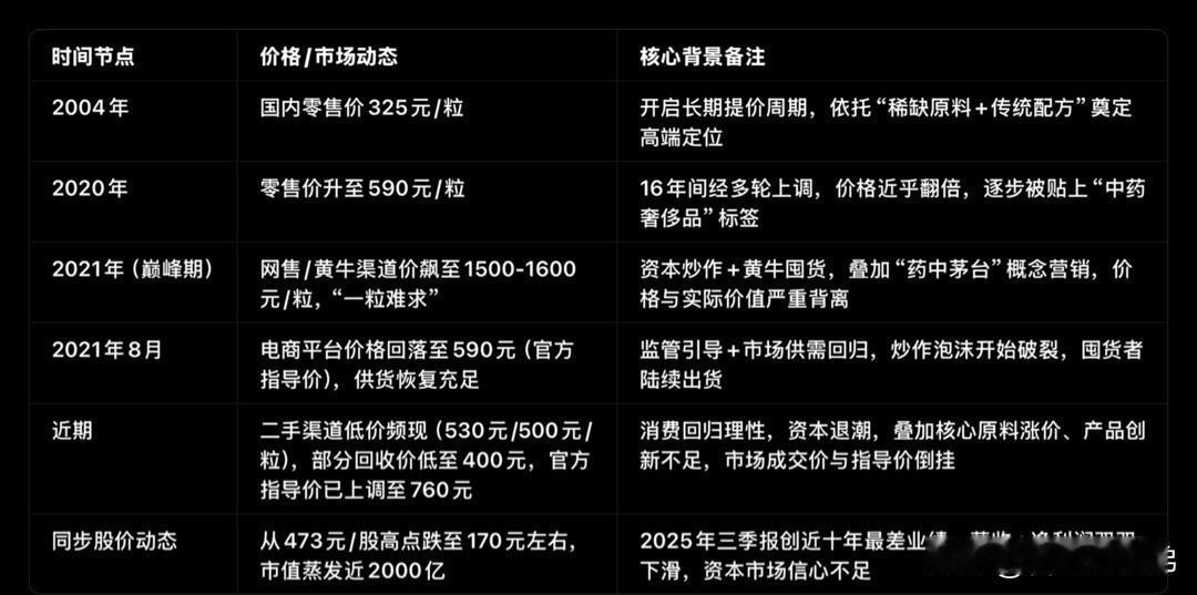 2004到2020年19次提价,325元/粒飙到590元,2021年巅峰时黄牛价更是炒到1600元仍一药难求。可如今风水轮流转,官方指导价涨到760元,电商平台却低至590元,二手回收价甚至暴跌到400元,药店坦言一个月卖不了几颗。 股价更惨,从473元高点跌到170多元,市值蒸发近2000亿,2025年三季报创下近十年最差业绩,营收净利润双双下滑。核心原料涨价、资本炒作退潮、消费回归理性,叠加产品单一创新不足,“药茅”终究扛不住了。 连茅台都在降温,靠炒作撑起的高价神话本就不长久,药品终究要回归疗效本质,而非礼品和投资属性啊!