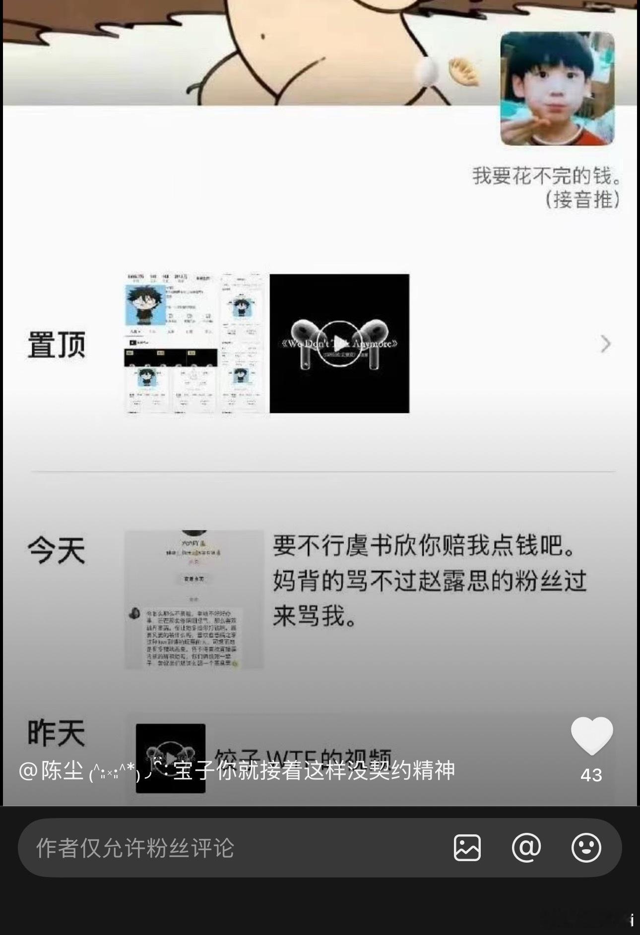虞书欣工作室发博了,前排全是维权饺子事件的,卧鱼本想静静的营业多来几次脱敏,粉丝又给她找事,明天这件事就会在dy传开我不行了,难怪卧鱼那么爱训粉,一群惹祸精[泪奔][泪奔][泪奔]