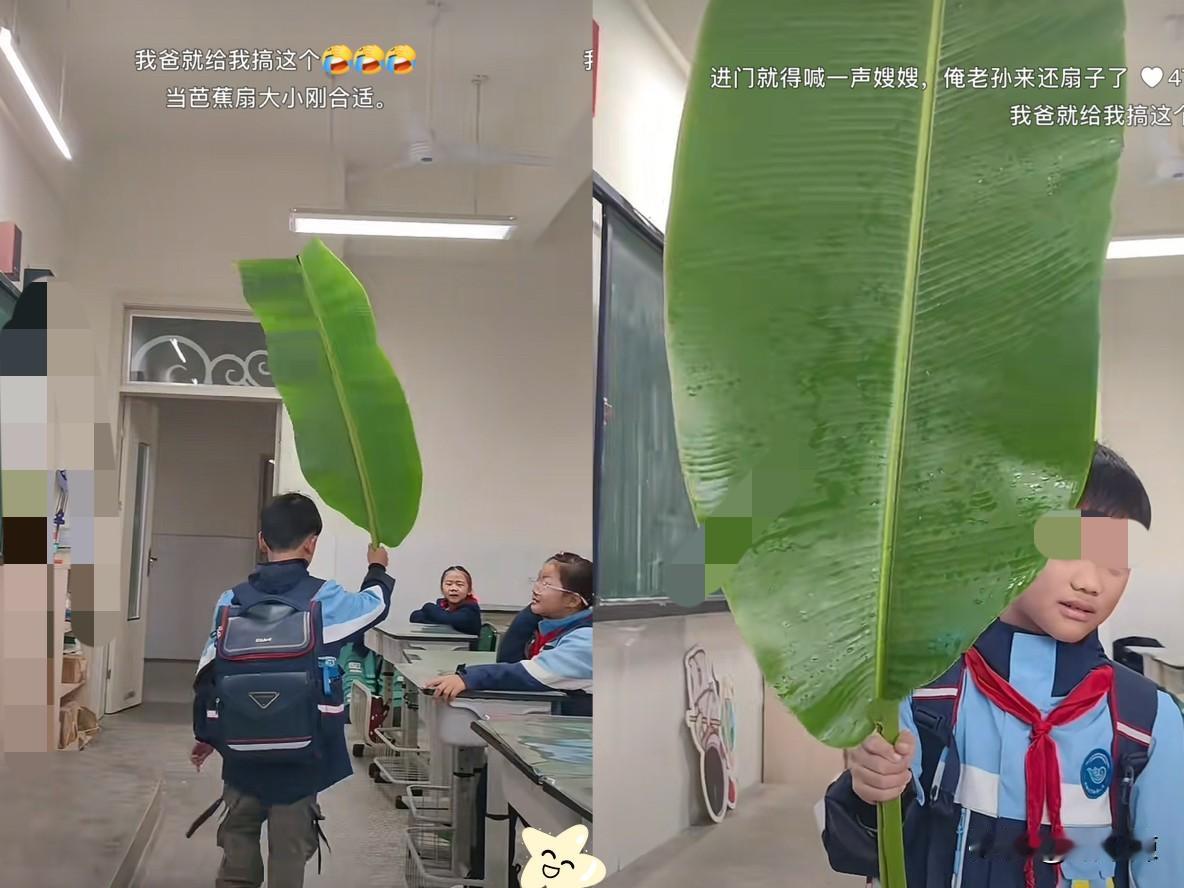 四川一老师给同学安排任务, 让他们自己找片叶子上课用, 可没想到,一个小男孩竟然直接扛了一片“芭蕉叶”过来,把老师都看呆了! 那芭蕉叶比人还宽,扛在肩上堪比小遮阳伞,老师都忍不住打趣:“你这是要给全班挡雨吗?” 网友更是笑疯:“这妈妈怕不是铁扇公主本主?” 其实仔细想想,这娃也太可爱了!要么是把“合适”听成了“最大”,要么是想做全班最特别的仔,关键叶子还洗得干干净净,这份认真又执拗的劲儿,真的戳中人心! 好多人说这芭蕉叶上课用不上,但我觉得这才是童年最棒的样子啊! 比起千篇一律的小叶子,这片“超标”芭蕉叶会成为全班多年后还能笑着聊起的回忆,这种不按常理出牌的童真,可比“标准答案”珍贵多了! 不管再过多少年,这片叶子都会被他们记在心中,其实不也蛮好的吗?