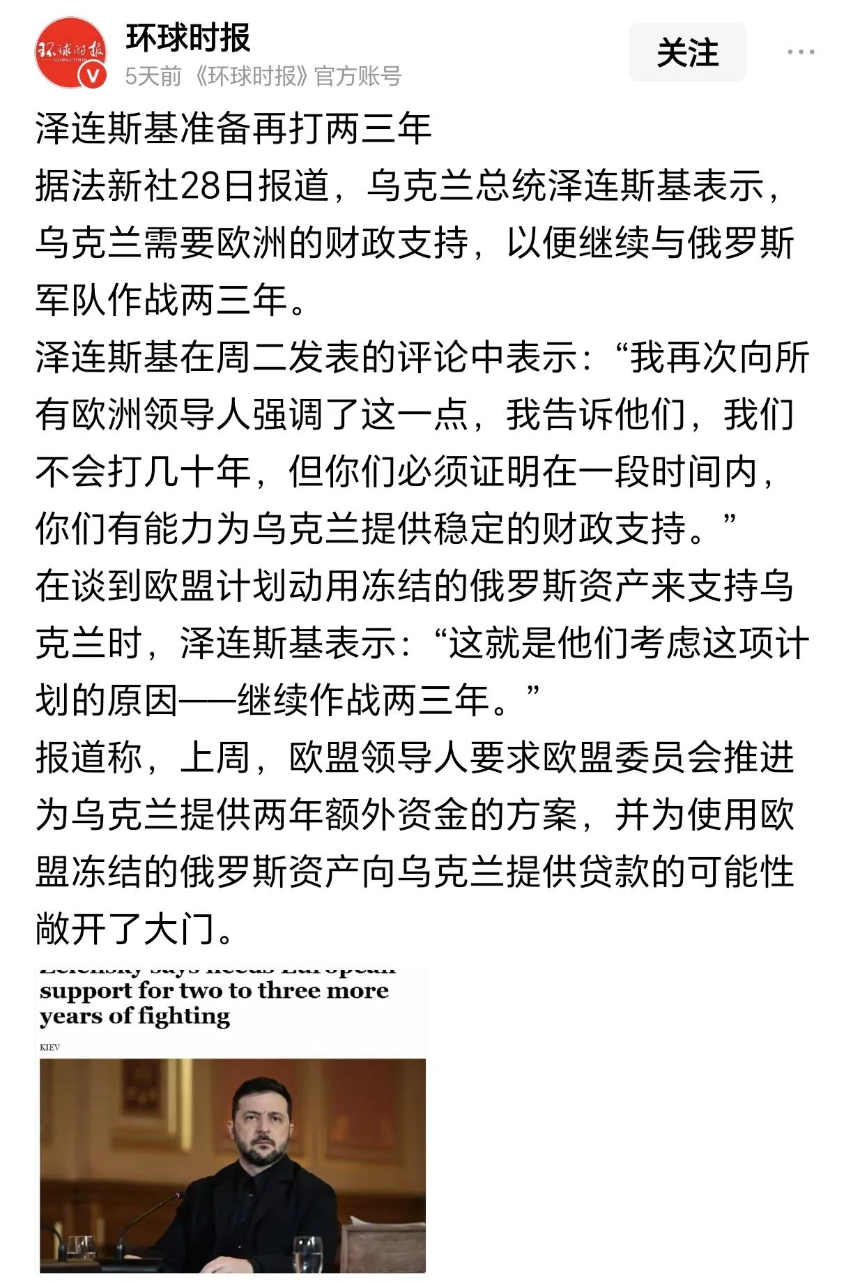 泽连斯基现在已逐渐走向末路,美国特朗普逐渐对他失去耐心、欧盟出兵又指望不上。 他要坚持自己打造的强硬爱国者人设不倒,来争取国内的民心。那就不能外对俄罗斯谈判中放弃任何土地,否则他下台了就真的十死无生了。 他最新的动态是:宣称要再和俄罗斯打两到三年。需要欧洲提供财政支持。 意思是欧洲负责出钱,乌克兰负责出人。而要让乌克兰民众继续去前线当兵填线、配合征兵工作,那在舆论宣传上就必须要保持“坚持不放弃任何一寸土地”的爱国形象,以此鼓动乌克兰人民继续拥护他战斗下去。