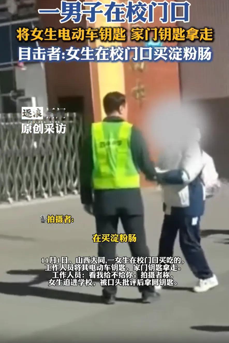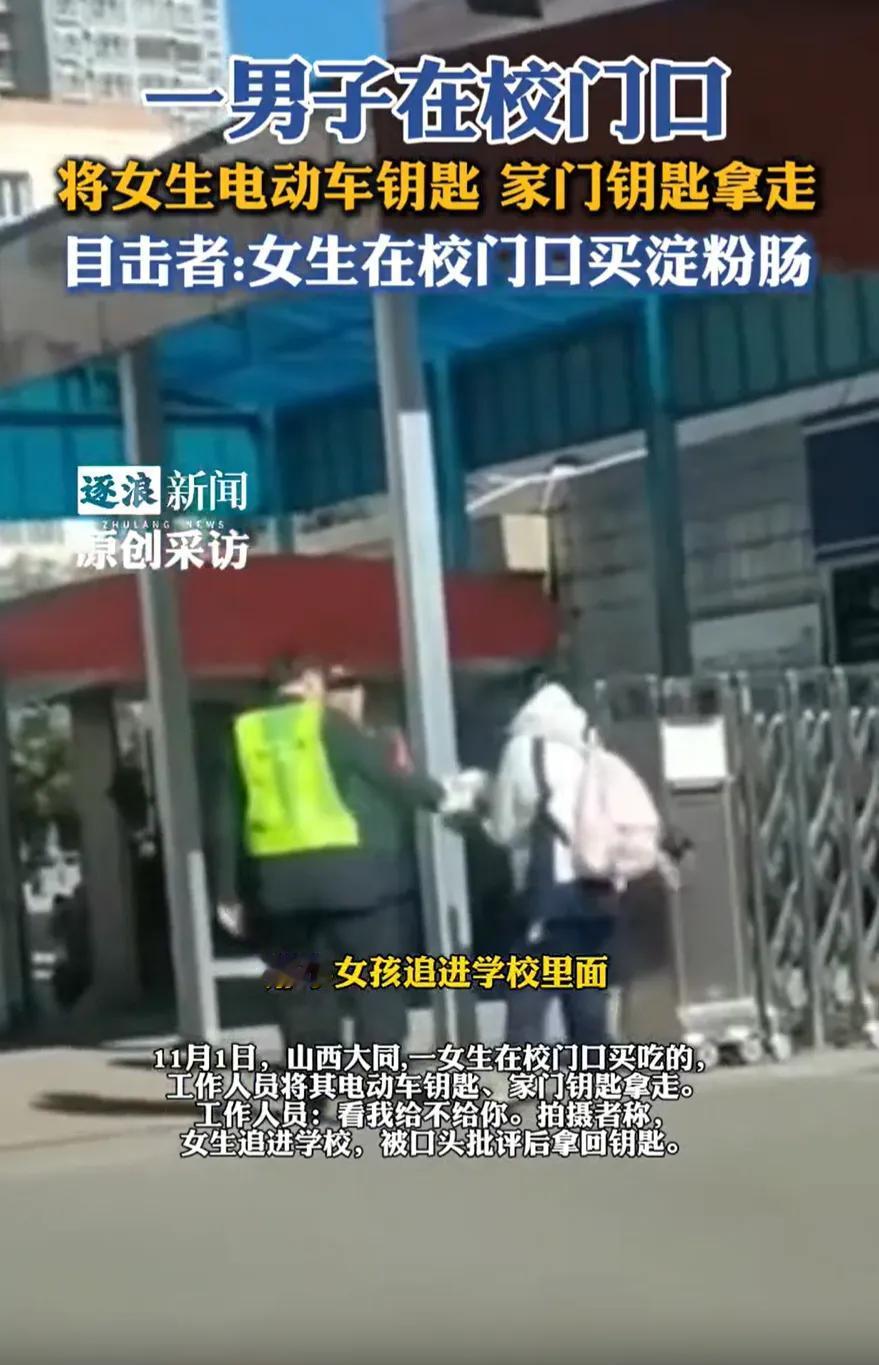 “吃根淀粉肠也挨罚?”山西大同,高校门口,女生刚咬一口淀粉肠,校内保安冲来,连人带车钥匙、家门钥匙全没收,女孩哭着追一路,保安甩手就走。网友:吃根肠犯了天条? 女生背着粉色书包出校,顺手买根烤肠,才转身,保安指着她喊“又买垃圾食品”,一把拔走整串钥匙,女生追上去哭喊“还给我”,对方头也不回往校门里走。 视频里,女孩边跑边抹泪,围观家长看不下去,帮拦人,保安只甩一句“再买试试”,速度更快,硬是把钥匙塞进自己口袋,留下学生原地跺脚。 校方的通报随后贴出:已成立专班,全面核查,将依规处理,可钥匙仍扣在值班室,学生回不了家,先得写情况说明,再等领导签字。 评论区炸锅:“怕地沟油你科普啊,抢钥匙算哪门子教育?”更多人贴出童年照:当年蹲校门口吃肠的娃,也没见谁家被抄钥匙,别让管理粗暴代替说理。 对于这件事情,大家有什么看法?