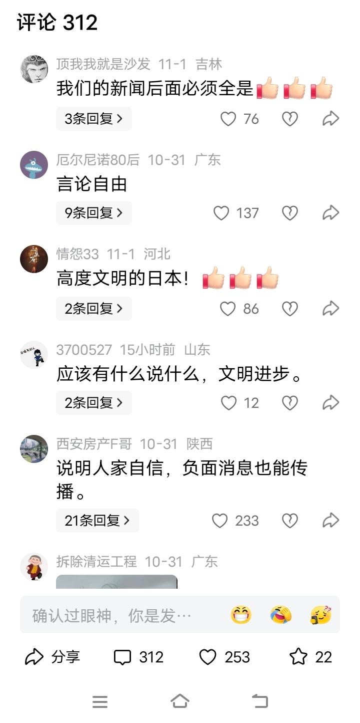 日本国内媒体都看不下去了,我们国内的殖人们却高潮了。 他们在评论区的各种冷嘲热讽,都被置顶和高赞,恰恰说明,我们的包容性太强了,任由他们表演和自爆。 其实,我更相信沉默的大多数,不屑于也不愿意在虚拟空间与这些殖人们一较短长。我线下问我身边的人,绝对没有认同这些网上殖人观点的。