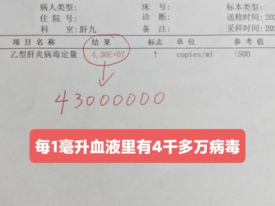 今年32岁的小刘,在婚检的时候检查出了乙肝阳性,表面抗原3400多,病毒量足足有4.30E+07,是乙肝大三阳。每毫升的血液里就有43000000个病毒,趁着还没有肝损伤,赶紧给他开一些抗病毒药吃上。