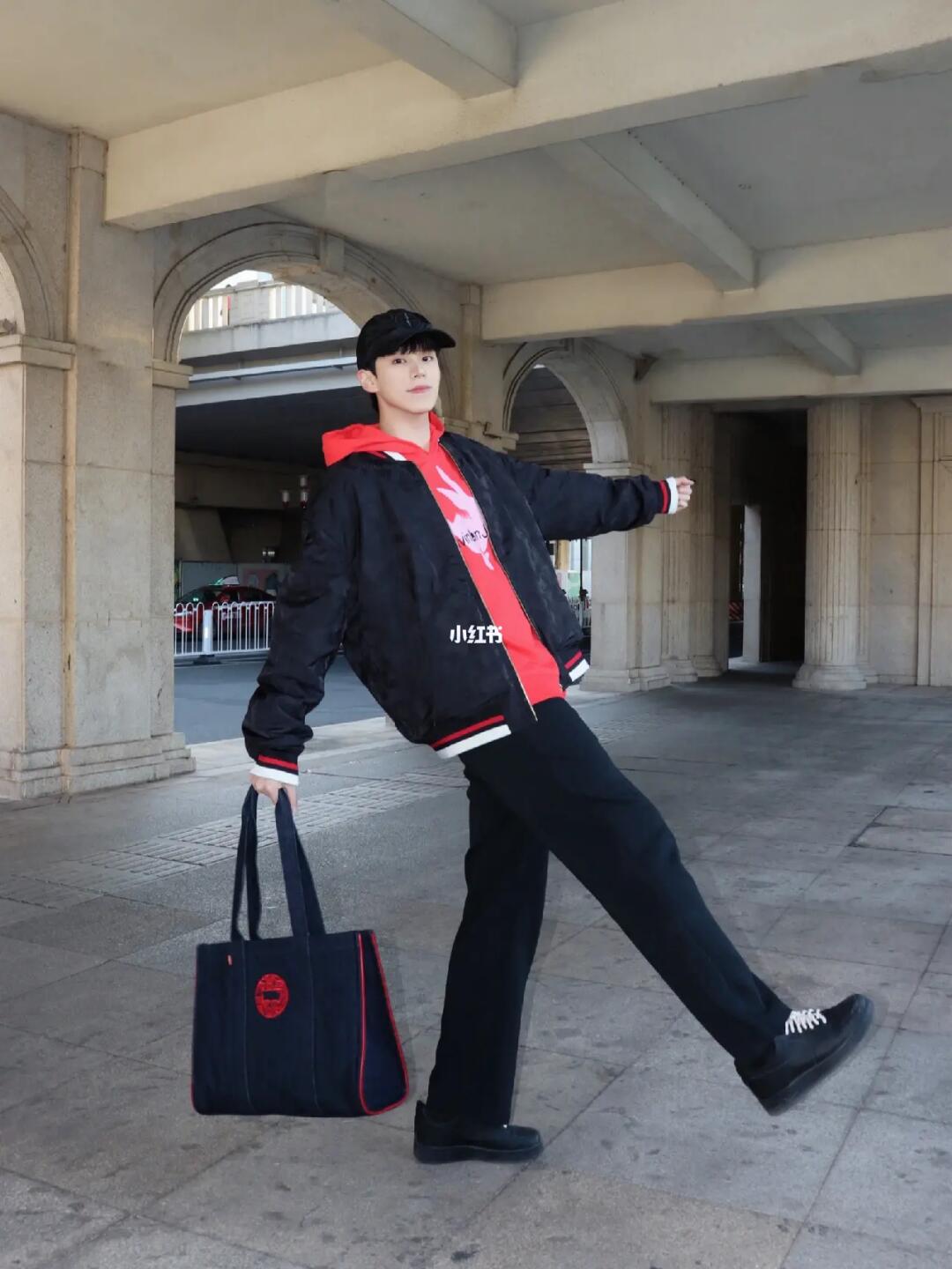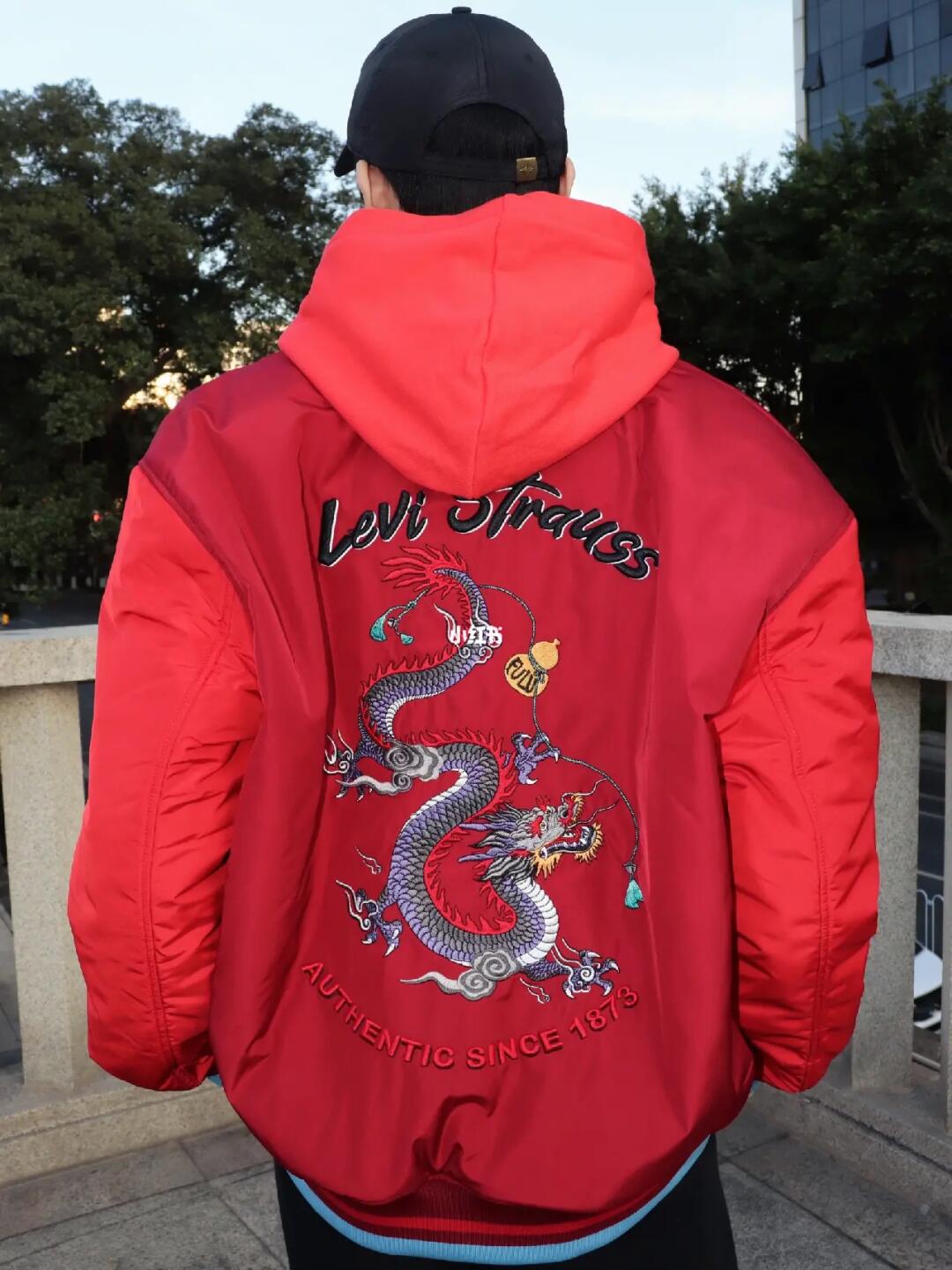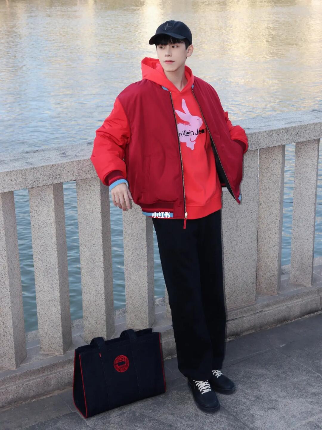 一想到马上要迎来2024年了, 心情还真是蛮激动的, 每年我都会提前安排上新年战袍, 今年当然少不了红色+龙元素! 我的新年穿搭给大家做个参考哦~ 黑红双面夹克外套+红色连帽卫衣+托特包, 一整身时髦又舒服, 新年氛围一整个拿捏住了! 红色连帽卫衣作为点缀刚刚好, 不会太过于抢眼。 这个穿搭思路大家也可以参考一下哦! 愿新年胜旧年, 龙年红红火火。 上天猫搜“天猫吉服”, 更多新年穿搭等你来挑哦! 【OOTD】 外套:李维斯 包包:李维斯 卫衣:ck