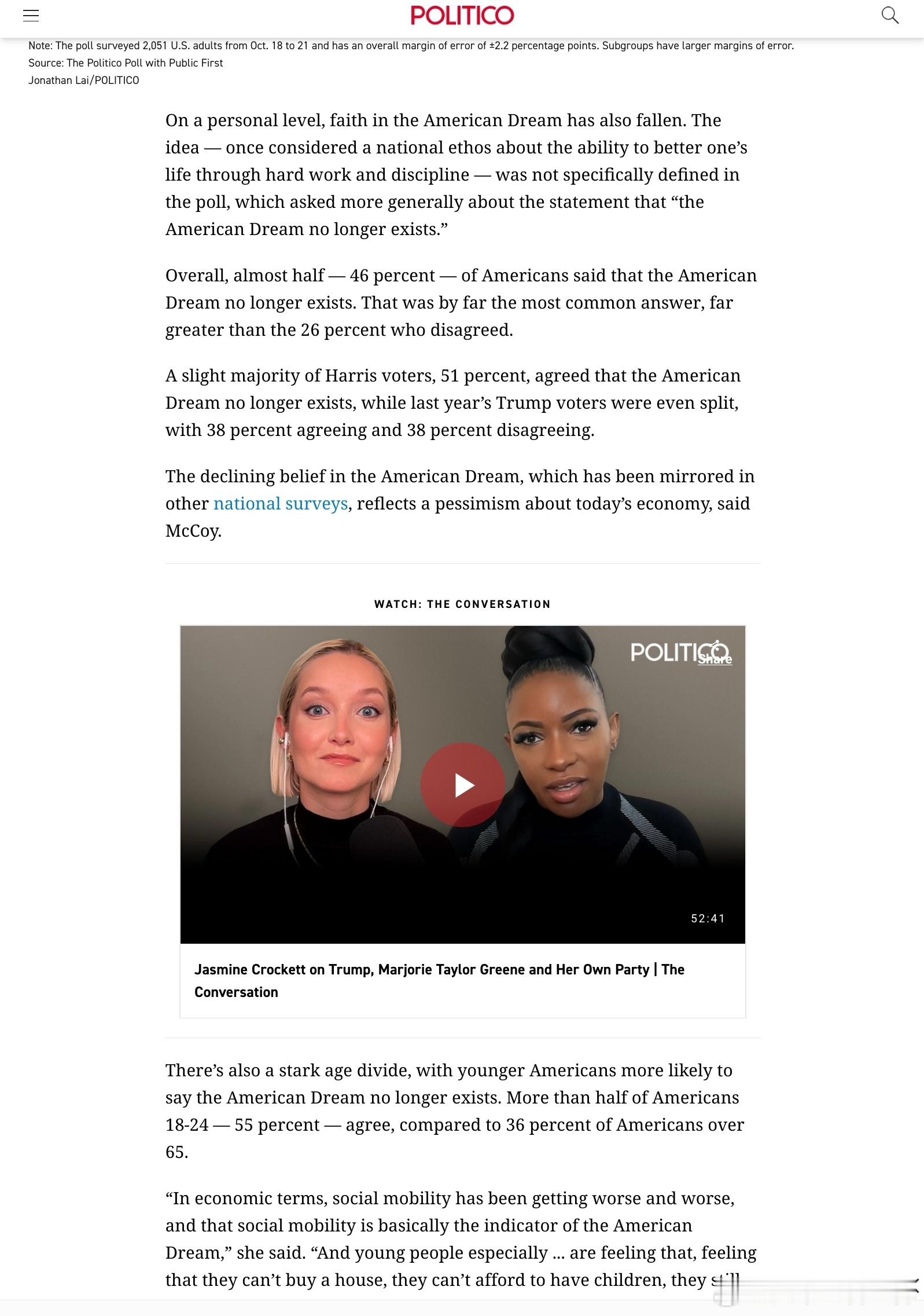 最新民调显示美国人对美国的看法,结果并不乐观。近半数(46%)的美国人认为“美国梦”已不复存在。这是迄今为止最常见的答案,远高于持相反意见的26%。此外,年龄差异也十分显著,年轻的美国人更倾向于认为“美国梦”已经不复存在。超过半数(55%)的18至24岁美国人认同这一观点,而65岁以上的美国人中只有36%的人持相同看法。