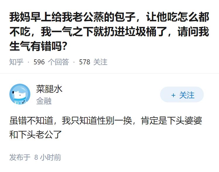 我妈早上给我老公蒸的包子,让他吃怎么都不吃,我一气之下就扔进垃圾桶了,请问我生气有错吗?