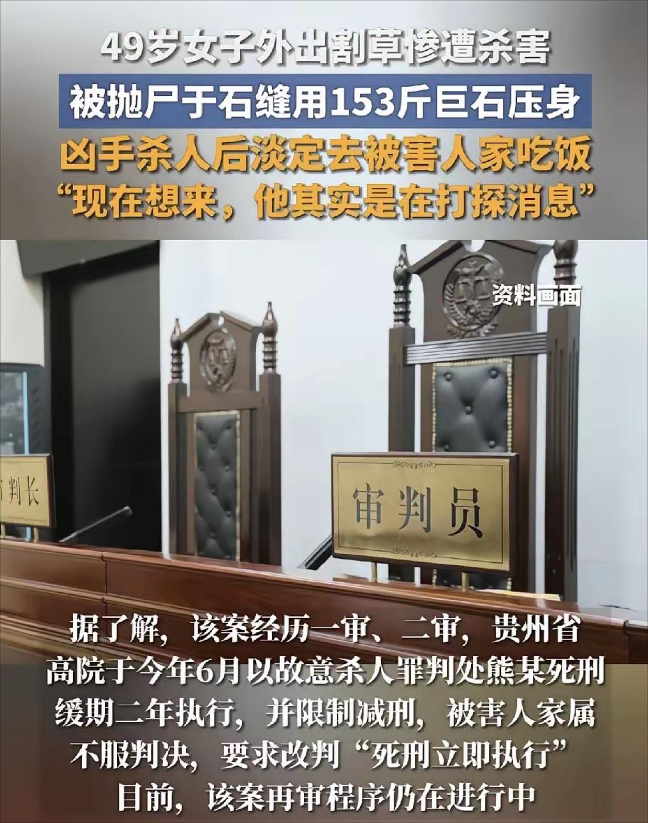 拒接几个电话,竟把命搭进去! 贵州黔西,49岁的王秀珍在外打工的丈夫和儿子不在身边,同村的熊某一个月狂拨60通骚扰电话。她不敢接,也懒得接,只想图个清净。 熊某却觉得自己被“拉黑”受了奇耻大辱。那天,他尾随王秀珍到山坡割草,堵住去路逼问为何拒接,再次动手动脚。王秀珍奋力反抗,熊某恼羞成怒,掏出随身尼龙绳将她活活勒死。 夜里,他返山毁证:扒光衣物付之一炬,把遗体塞进石缝,又搬来153斤巨石压顶。 事后,他装得比谁都热心:贴寻人启事、跟村民搜山、到死者家吃饭打听动静,一度没人怀疑。 最终警方抓住破绽,熊某才认罪。一审被判“死缓+限制减刑”,王秀珍家属坚决不服,已提请再审,要求立即执行死刑。 手段如此残忍,还玩“缓两年”,难怪众人质问:这到底留的是哪门子情?