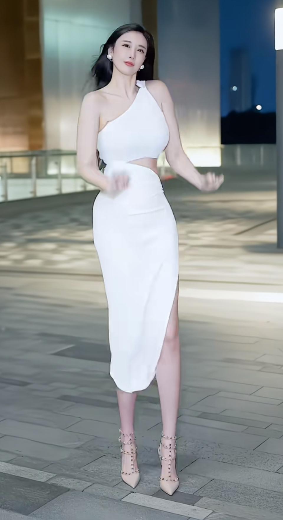 夜色为幕,白裙似光。单肩设计勾勒优雅肩线,腰侧镂空与裙摆开叉尽展灵动,铆钉高跟鞋为精致感加码,在都市建筑的光影里,每一次转身都是自信的绽放。