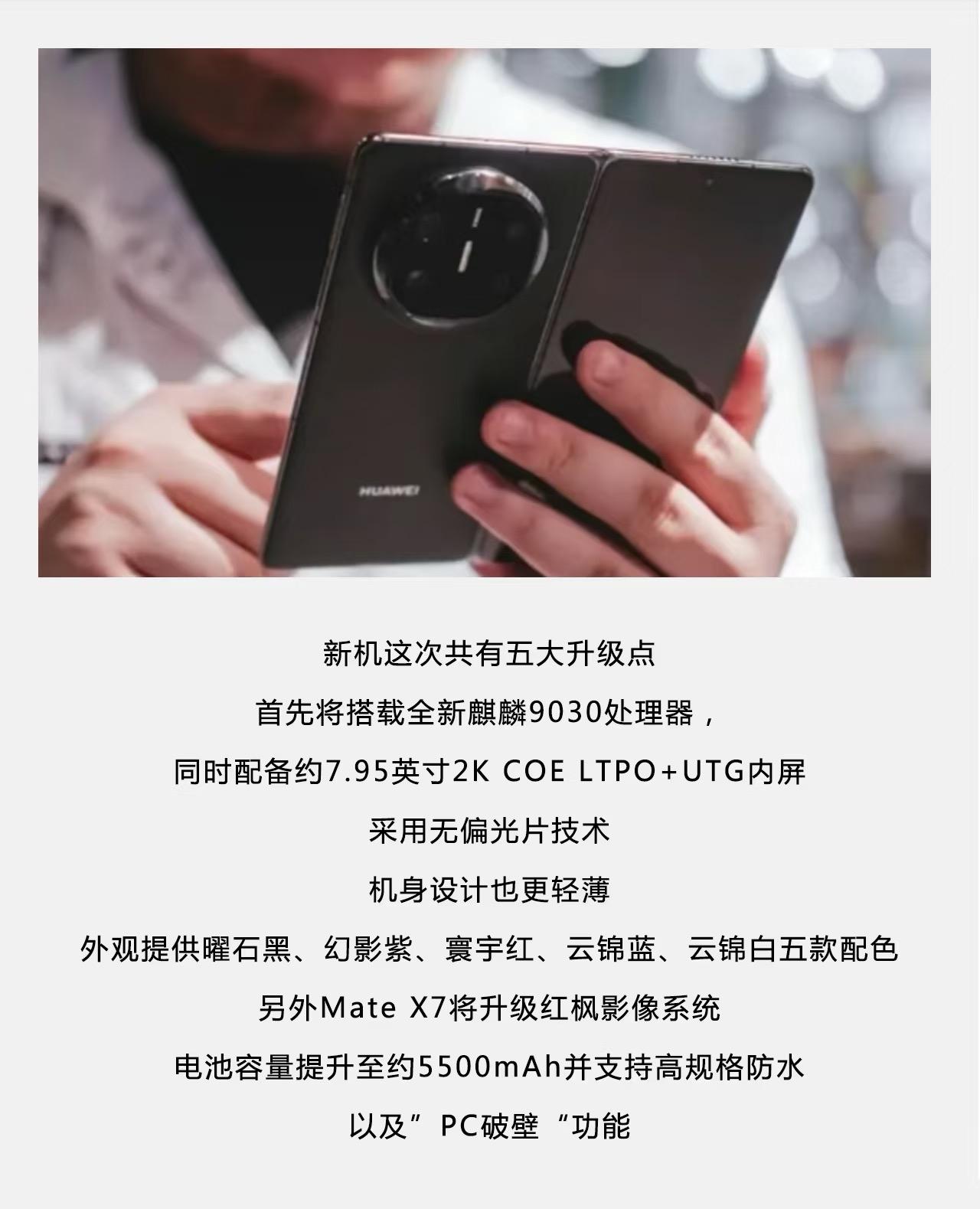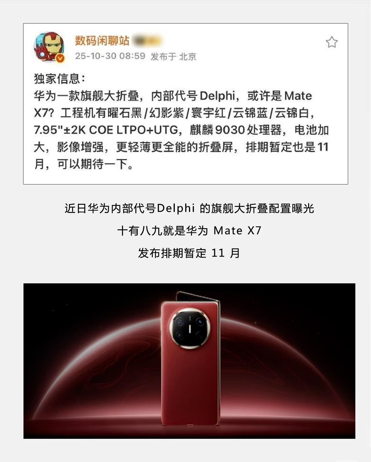 华为Mate X7要来了,暂定11月发布哦😉 这款内部代号“Delphi”的旗舰大折叠,参数简直太诱人啦!麒麟9030处理器超强劲,7.95英寸2K无偏光片内屏超酷炫,还有五种美美的配色。红枫影像系统升级,拍照肯定绝绝子,5500mAh大电池+高规格防水,再加上“PC破壁”功能,感觉办公都更方便了。这升级太豪华,狠狠期待住了。