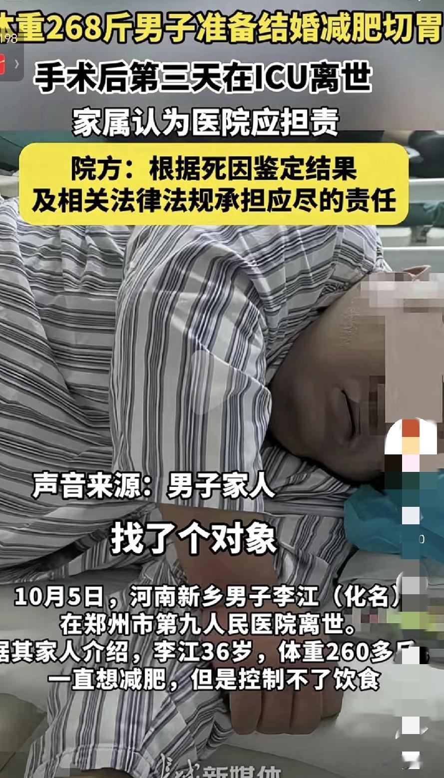 胖点就胖点呗,健康就好啊,吃嘛嘛香不好吗? 河南新乡一名36岁男子,体重268斤。 家人说他谈了一个女朋友,处的还挺好,就商量结婚准备见家长。寻思太胖了,先减减肥。 以前也试过各种方法,但由于控制不住饮食,毫无效果。 这次的减肥方法是将胃切除一部分。 没想到刚刚手术三天,这名男子就在lCU去世了。 你说这是何苦呢?家人得有多后悔,早知命会没了,打死也不会让他去做这个手术啊。 凡是叫手术的都存在风险,不然为什么要家属签字呢?