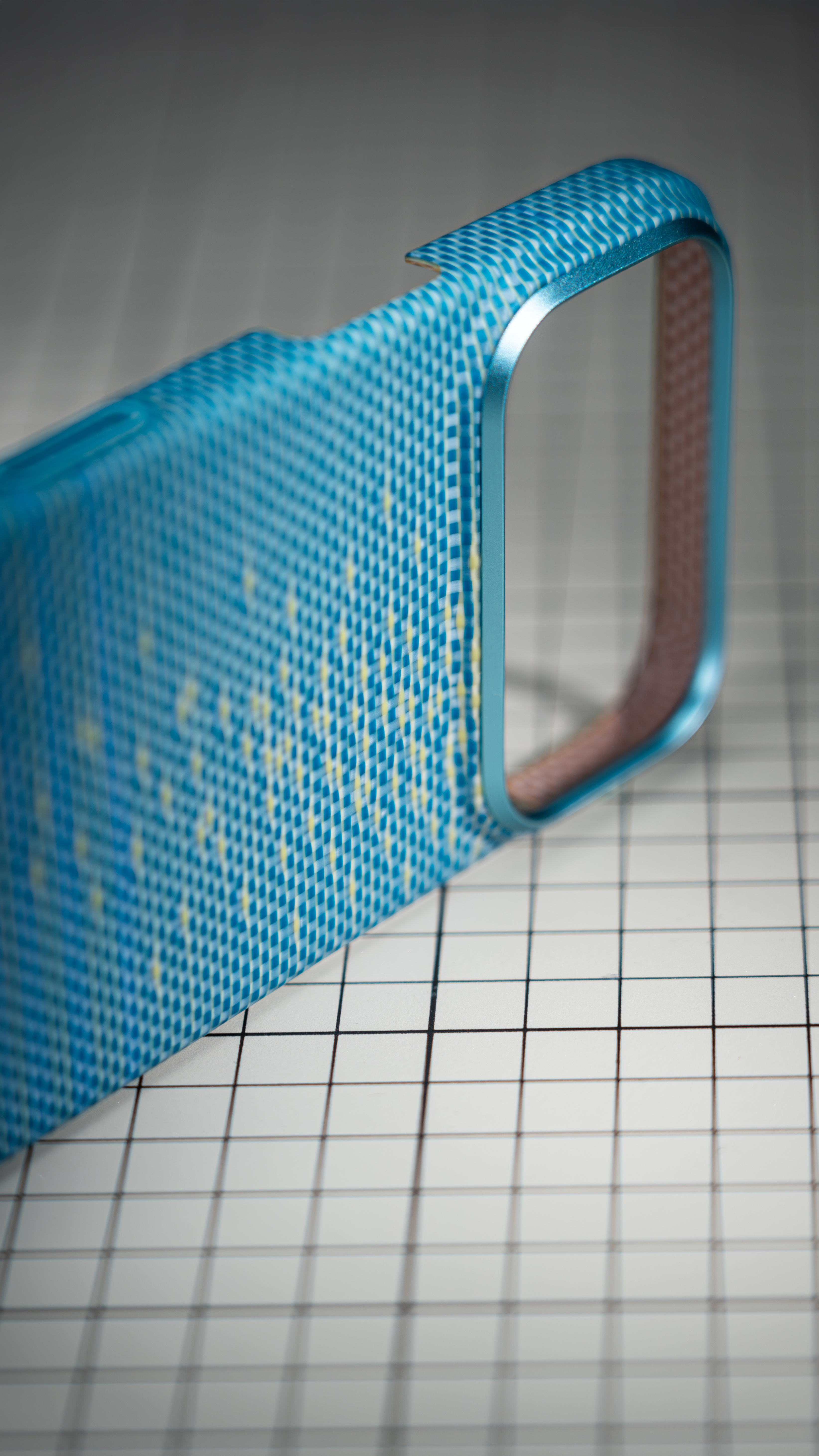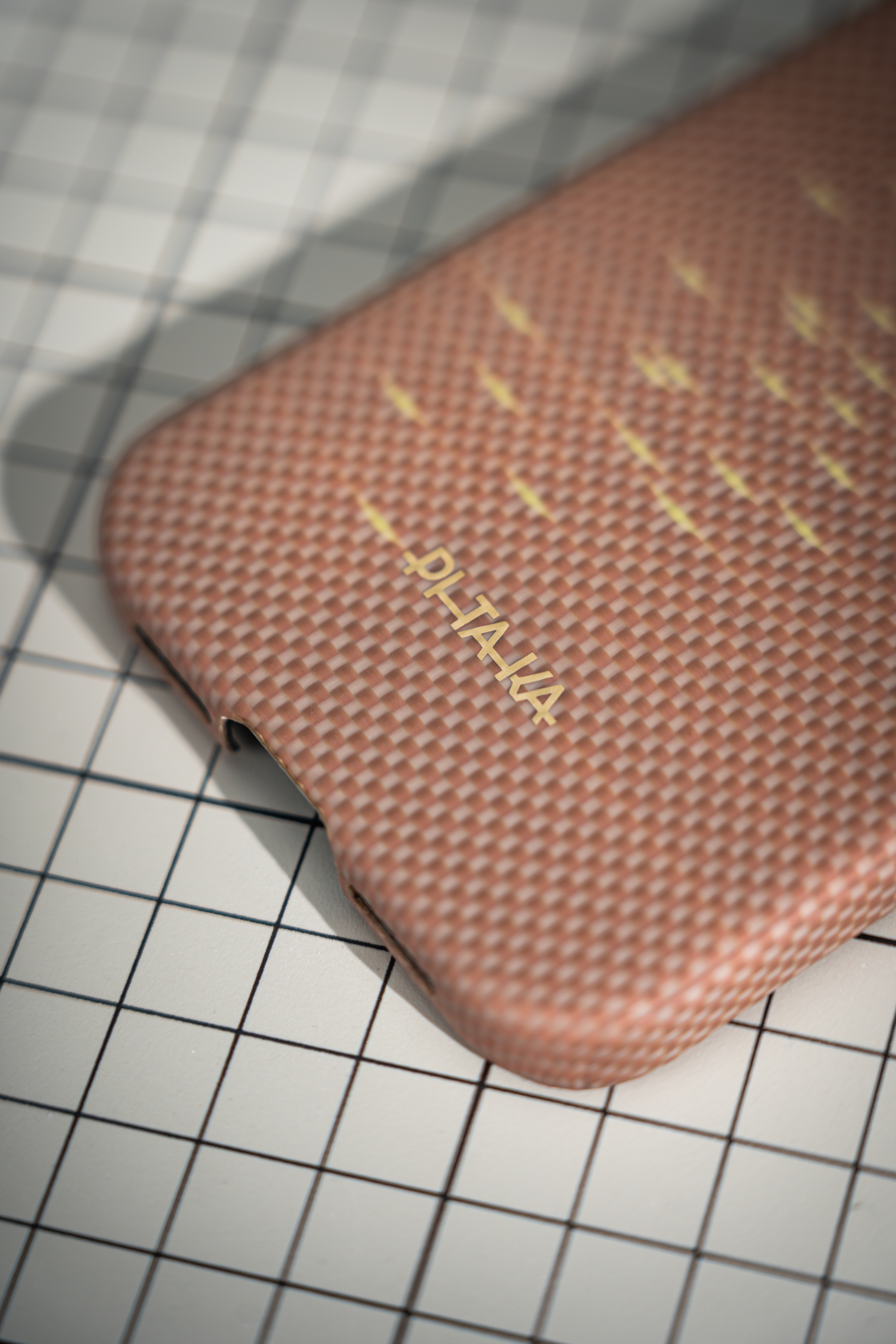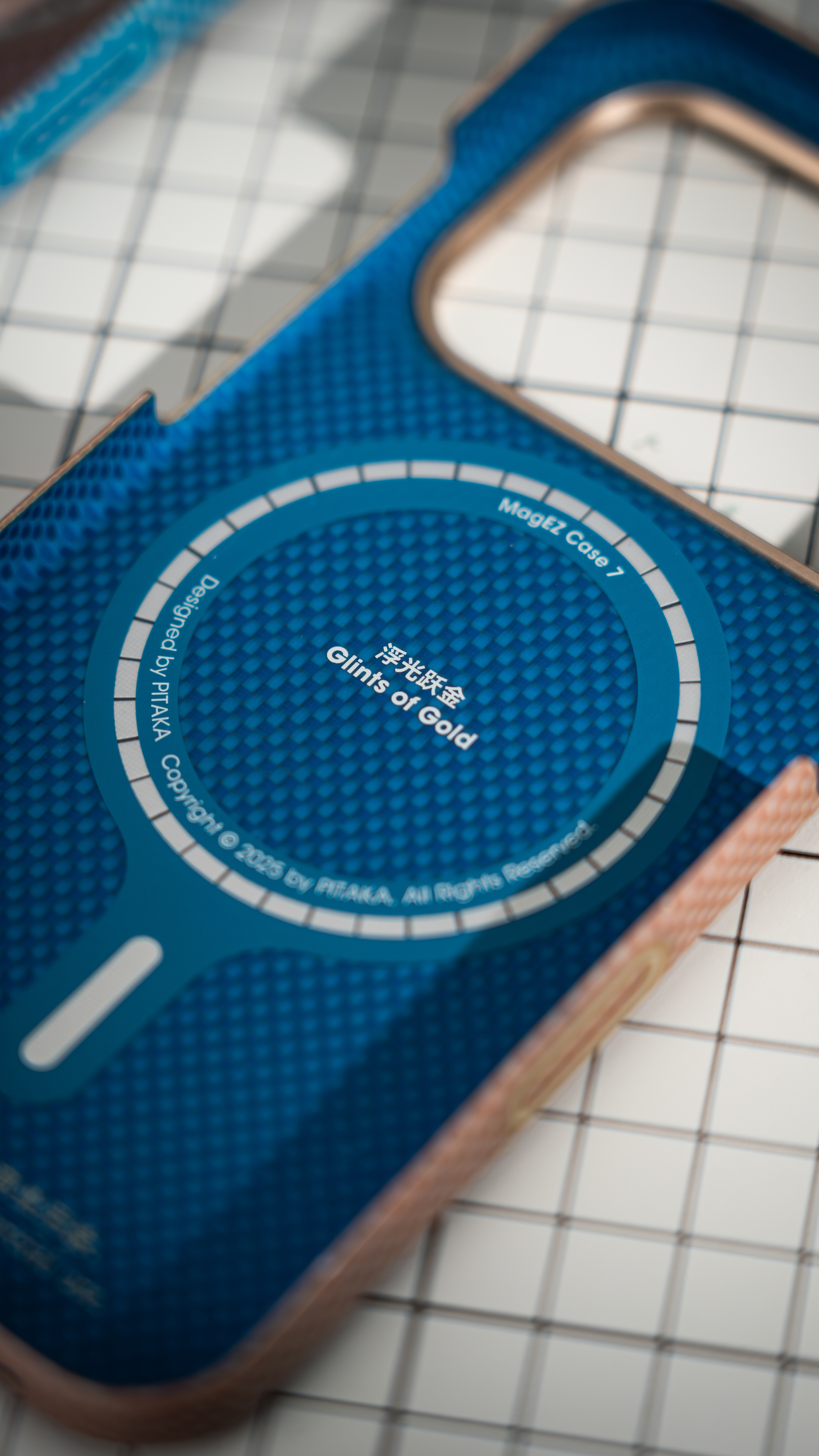 来康康PITAKA新出的「浮光跃金」凯夫拉手机壳,全包设计,纹理像是波光粼粼的水面,这个设计有点好看,而且真的有一种闪光的效果,仔细看了一下,他们在代表光斑的黄色周围加一圈白色包边,这个编织工艺有点复杂的,在芳纶纤维这块儿,PITAKA确实是玩的专业。