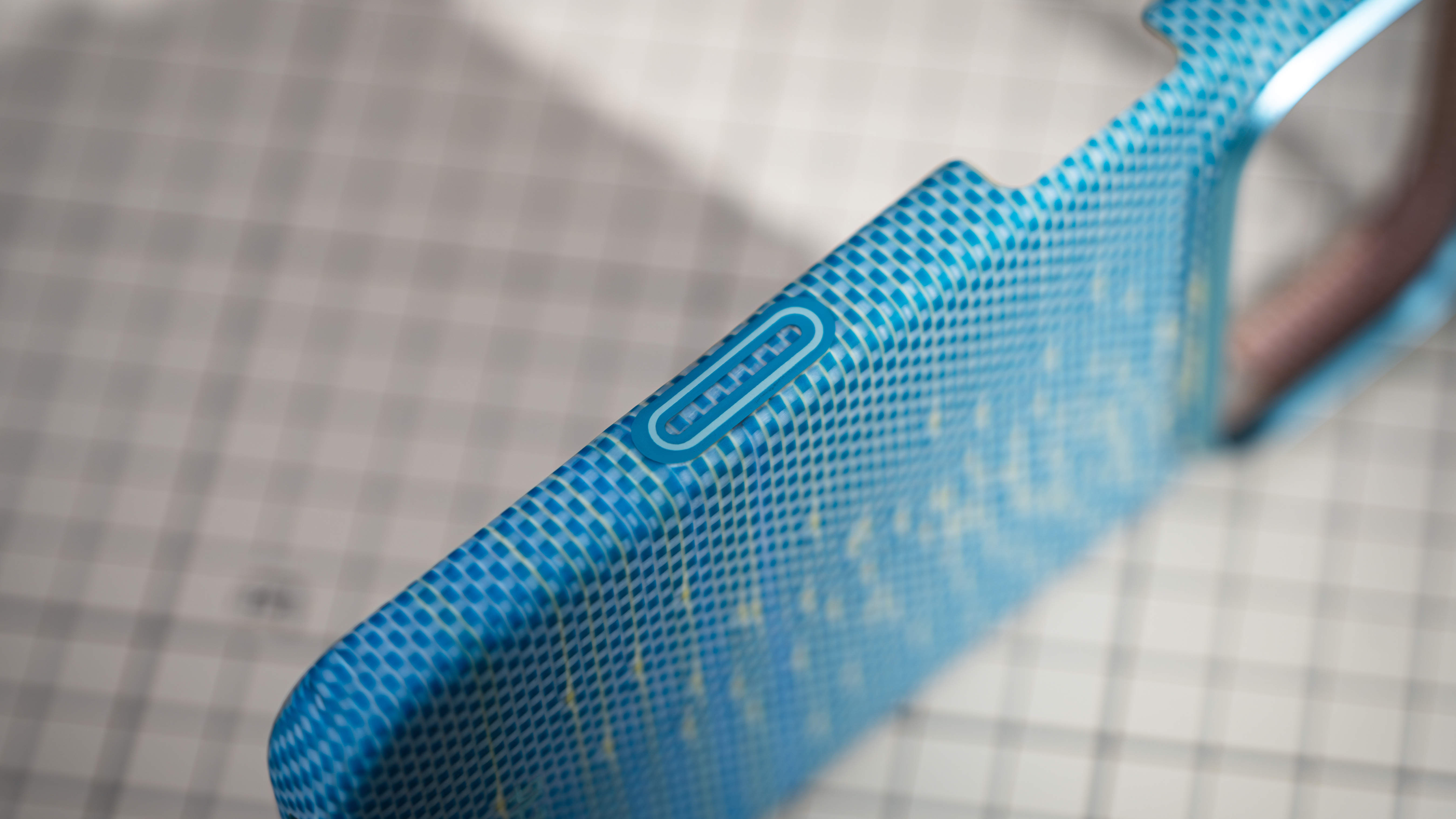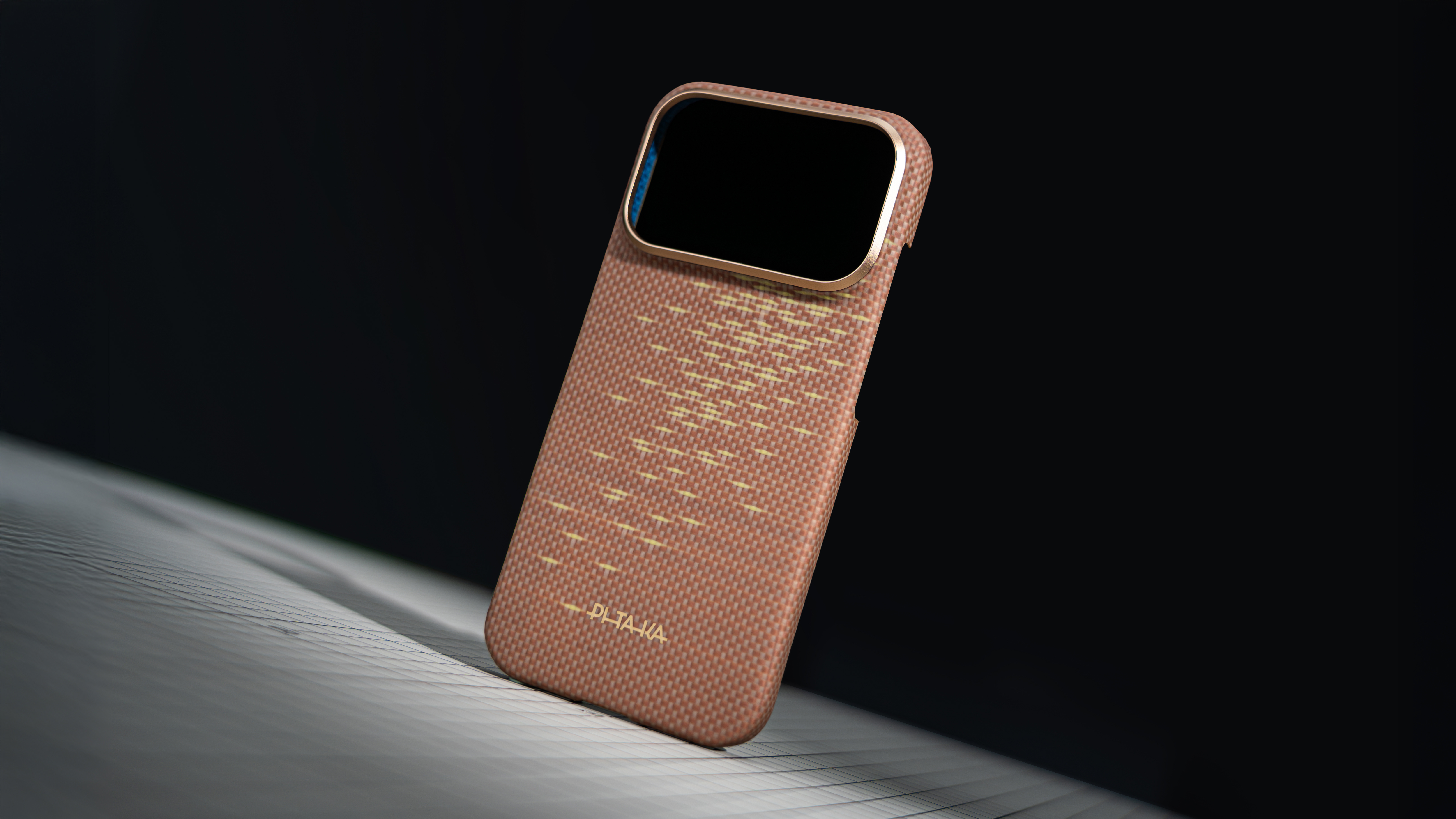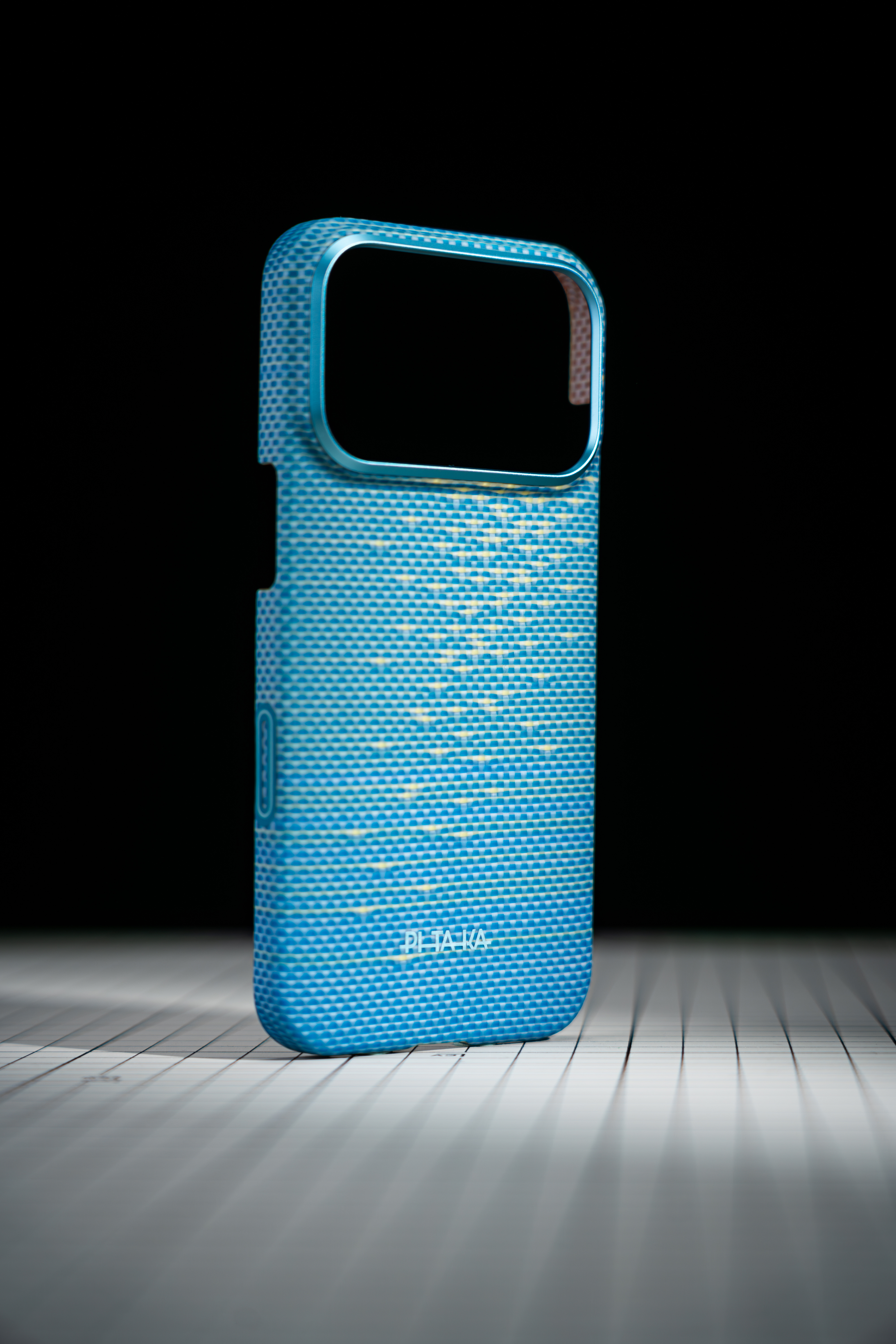 来康康PITAKA新出的「浮光跃金」凯夫拉手机壳,全包设计,纹理像是波光粼粼的水面,这个设计有点好看,而且真的有一种闪光的效果,仔细看了一下,他们在代表光斑的黄色周围加一圈白色包边,这个编织工艺有点复杂的,在芳纶纤维这块儿,PITAKA确实是玩的专业。