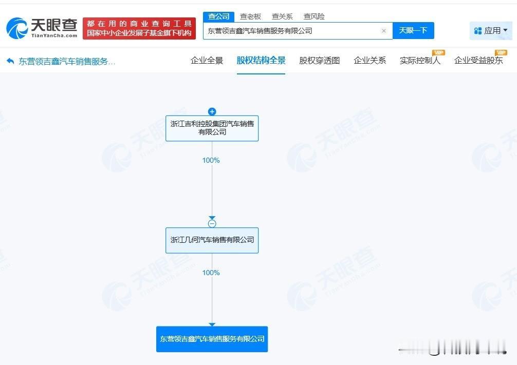 【吉利在东营成立汽车销售服务新公司 注册资本1000万】 天眼查工商信息显示,近日,东营领吉鑫汽车销售服务有限公司成立,法定代表人为朱其谦,注册资本1000万人民币,经营范围包括新能源汽车整车销售、汽车零配件零售、汽车零配件批发等。股权全景穿透图显示,该公司由浙江几何汽车销售有限公司全资持股,后者为浙江吉利控股集团汽车销售有限公司全资子公司。 天眼查信息: