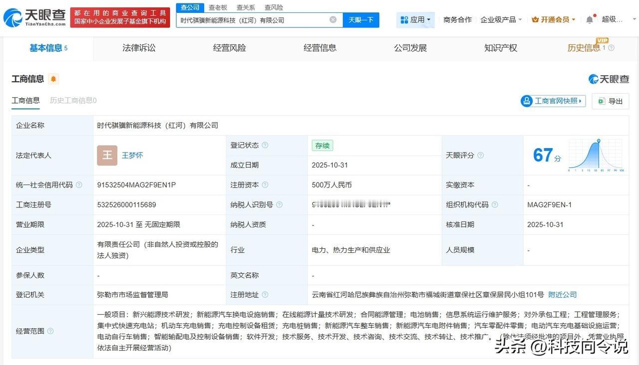【宁德时代在云南红河成立新能源科技公司 注册资本500万】 天眼查App显示,近日,时代骐骥新能源科技(红河)有限公司成立,法定代表人为王梦怀,注册资本500万人民币,经营范围包括新兴能源技术研发、新能源汽车换电设施销售、在线能源计量技术研发等。股东信息显示,该公司由宁德时代旗下时代骐骥绿能科技(昆明)有限公司全资持股。 天眼查信息: