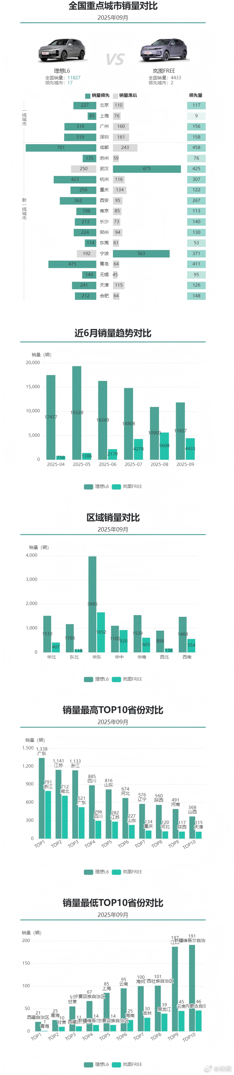 首先看最核心的全国销量,理想L6卖了11827辆,岚图FREE是4433辆,L6的销量几乎是FREE的三倍。这已经不是同一个量级的竞争了,说明在主流消费者心中,理想L6的品牌认知、产品定位和性价比获得了更广泛的认可。